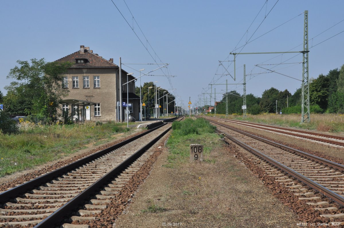 Ruhland | 98,32 | km 32,92 der Strecke Großenhain Cottb. Bf 0,0 - Senftenberg 45,29 - Cottbus 79,67 - Frankfurt (Oder) Pbf 152,85 (Personenzuggleise)/152,79 (Güterzuggleise) |
