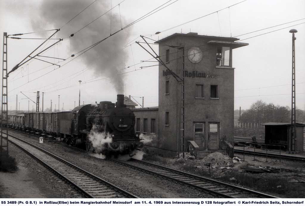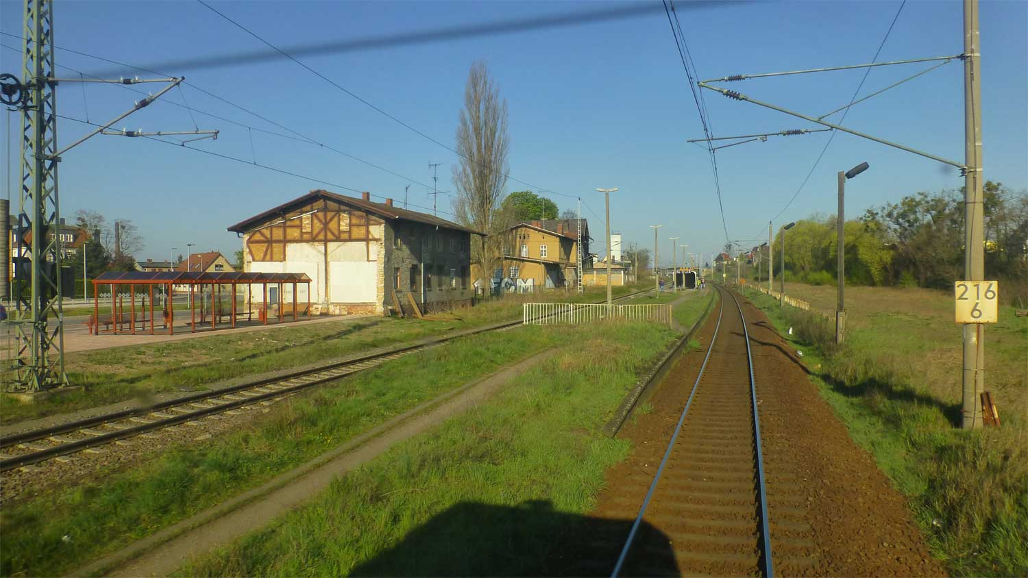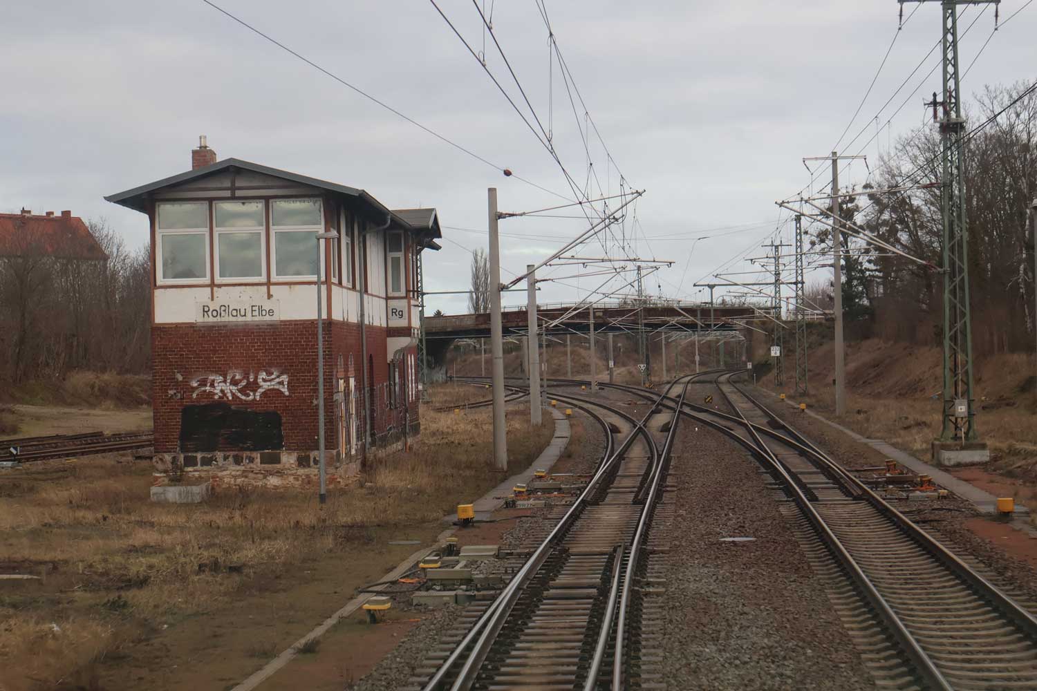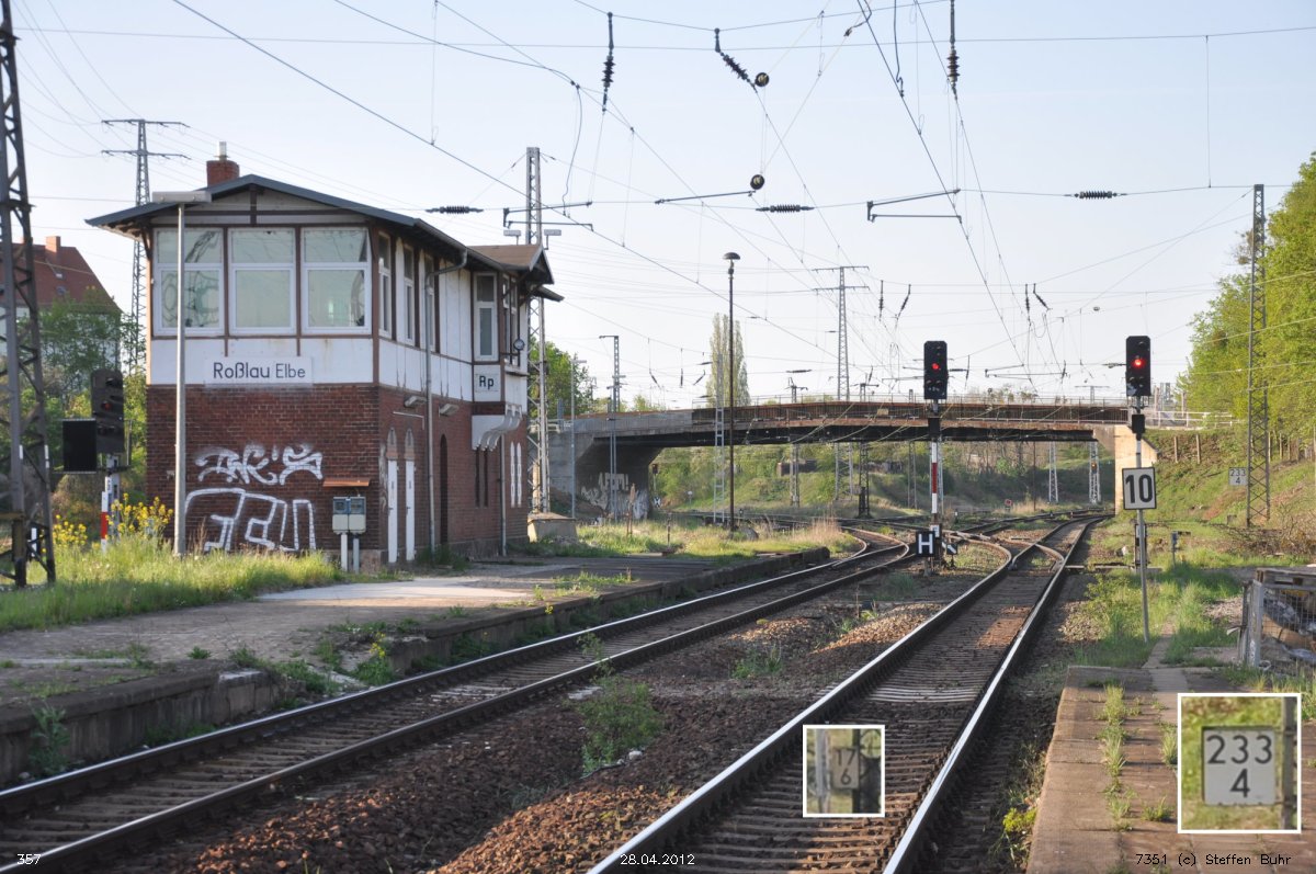 Roßlau (Elbe) | 233,67 | km 17,94 der Strecke (Biederitz 0,68 - Güterglück 25,87 - Landesgrenze Preußen/Anhalt km 30,320) = km 0,0 - Dessau Hbf 22,96 - Bitterfeld 48,51 - Leipzig Hbf 81,26 |