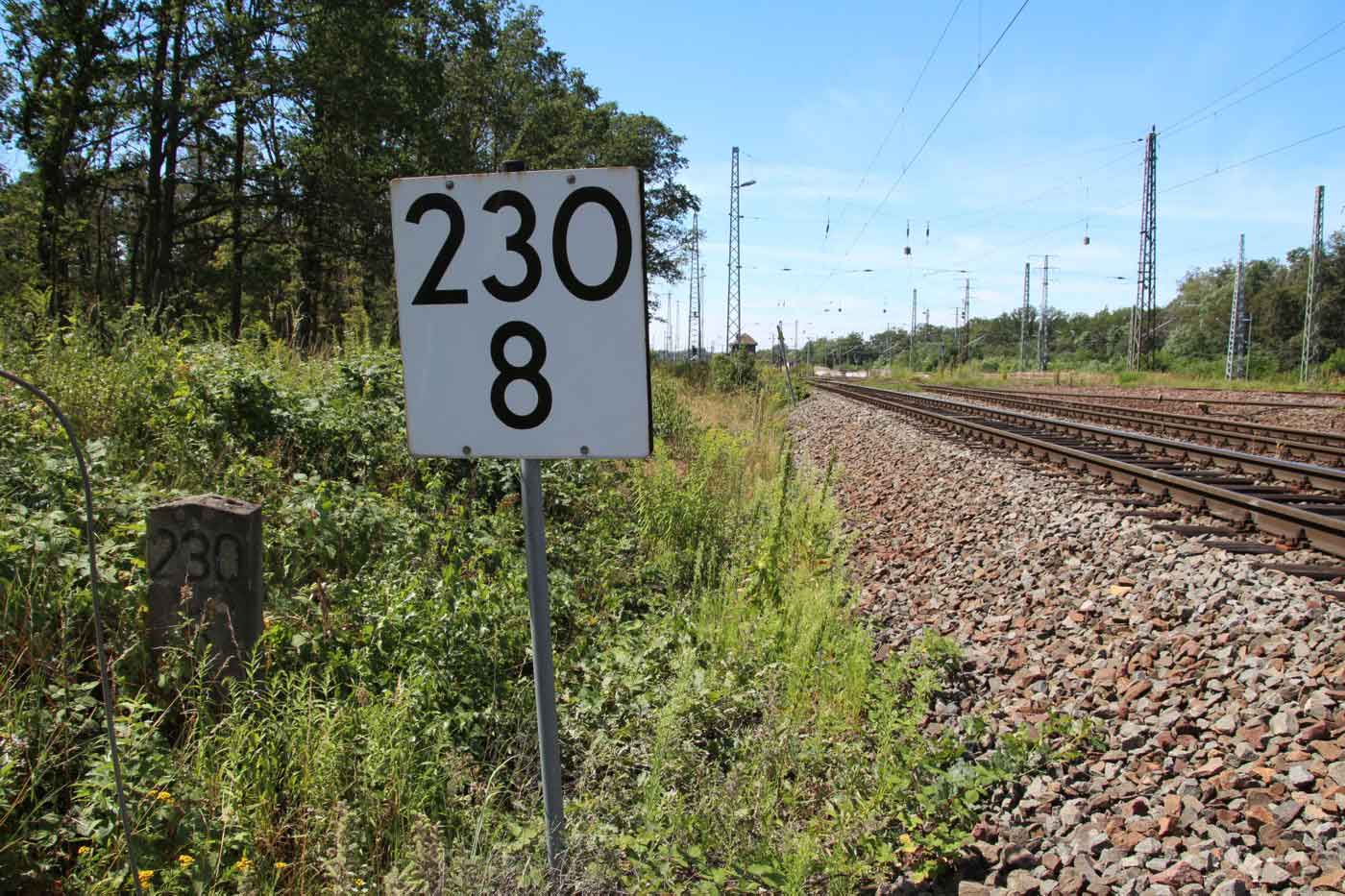 km 230,8 (Tafel) und km 230,9 (Stein) in Roßlau-Meinsdorf - Blick Richtung Węgliniec (Kohlfurt)