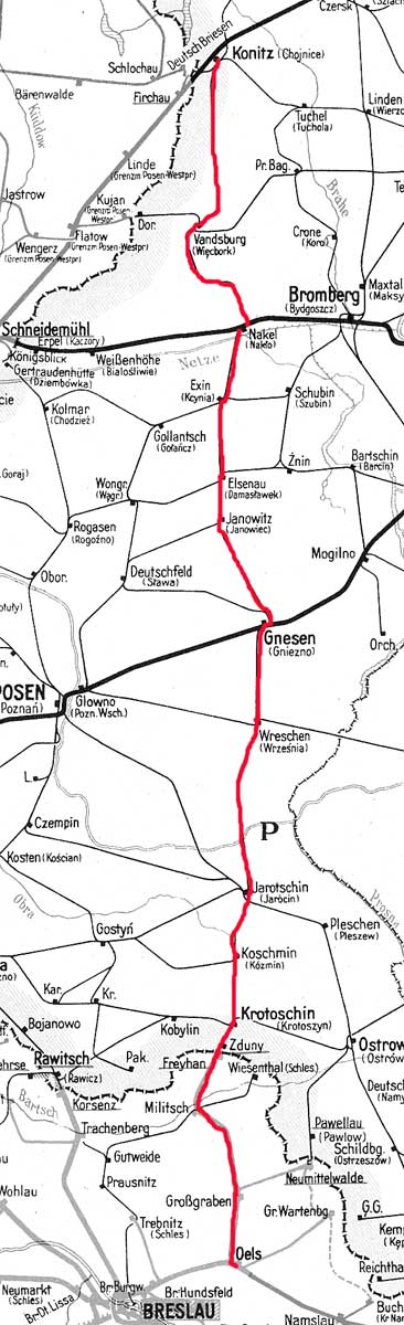 Konitz (Westpr) 0,0 - Vandsburg 40,626 - Nakel 75,299 - Rbd Grenze Danzig/Posen 83,200 - Exin 90,974 - Elsnau 111,488 - Gnesen 150,346 - Wreschen 174,077 - Jarotschin 215,767 - Krotoschin 246,395 - Rbd Grenze Posen/Breslau 254,420 = km 55,89 - Oels 0,0 (1943)
