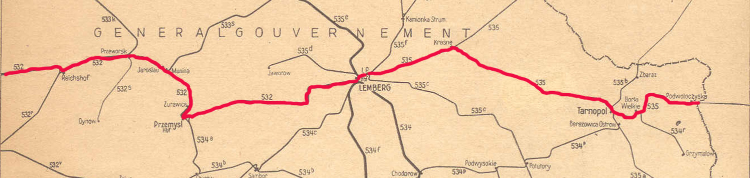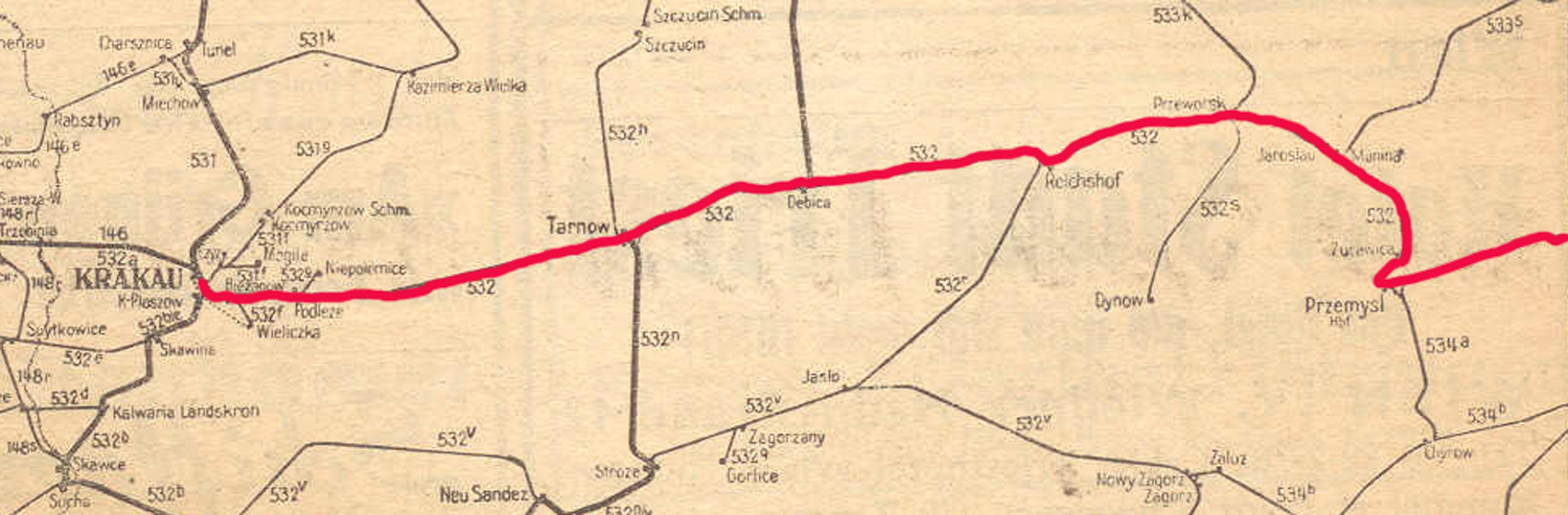 Krakau Hbf 0,0 - Tarnow 77,317 - Reichshof 157,415 - Przemysl Hbf 244,167 - Lemberg Hbf 341,655 - Tarnopol 481,696 - Rbd Grenze Ostbahn 534,551 - (Shmerinka)