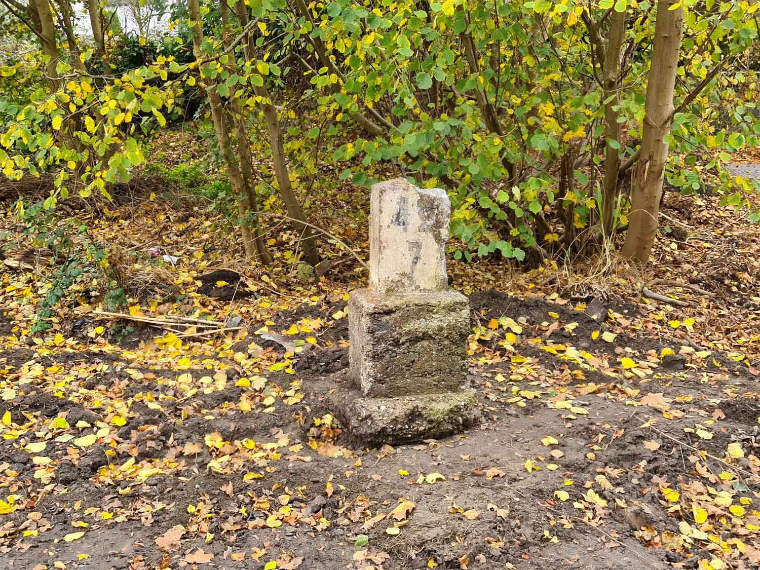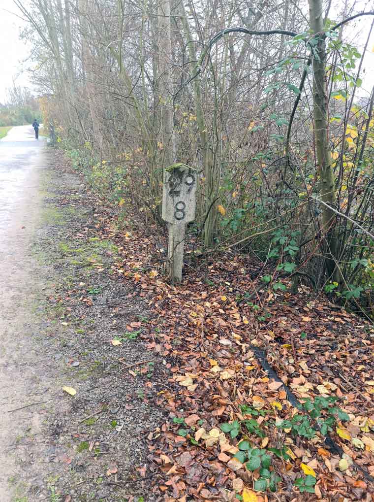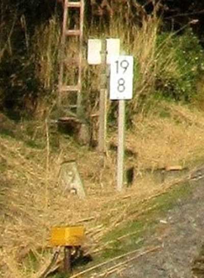 Die Kilometertafel ist wegen der Lichtraumumgrenzung so tief montiert.
