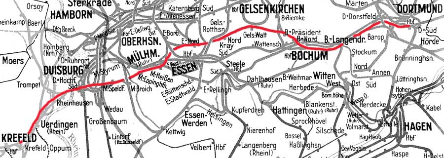 (Dortmund-Dorstfeld) | [65,50] | km 161,27 der Strecke (Aachen Hbf 0,0 bzw. 1,87) - Mönchengladbach Hbf 63,91 (kommend)/63,93 (gehend) - Krefeld Hbf 87,63 - Trajekt - Essen Hbf 129,52 - Soest 218,43 |