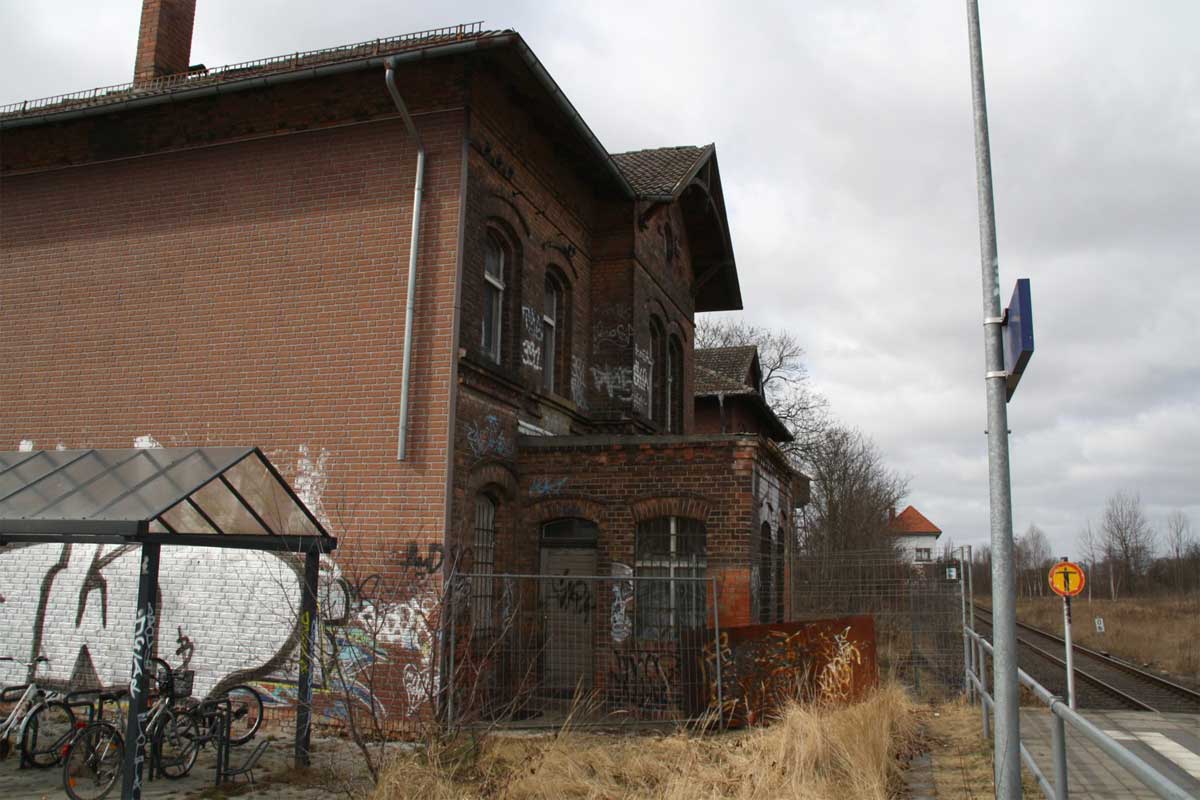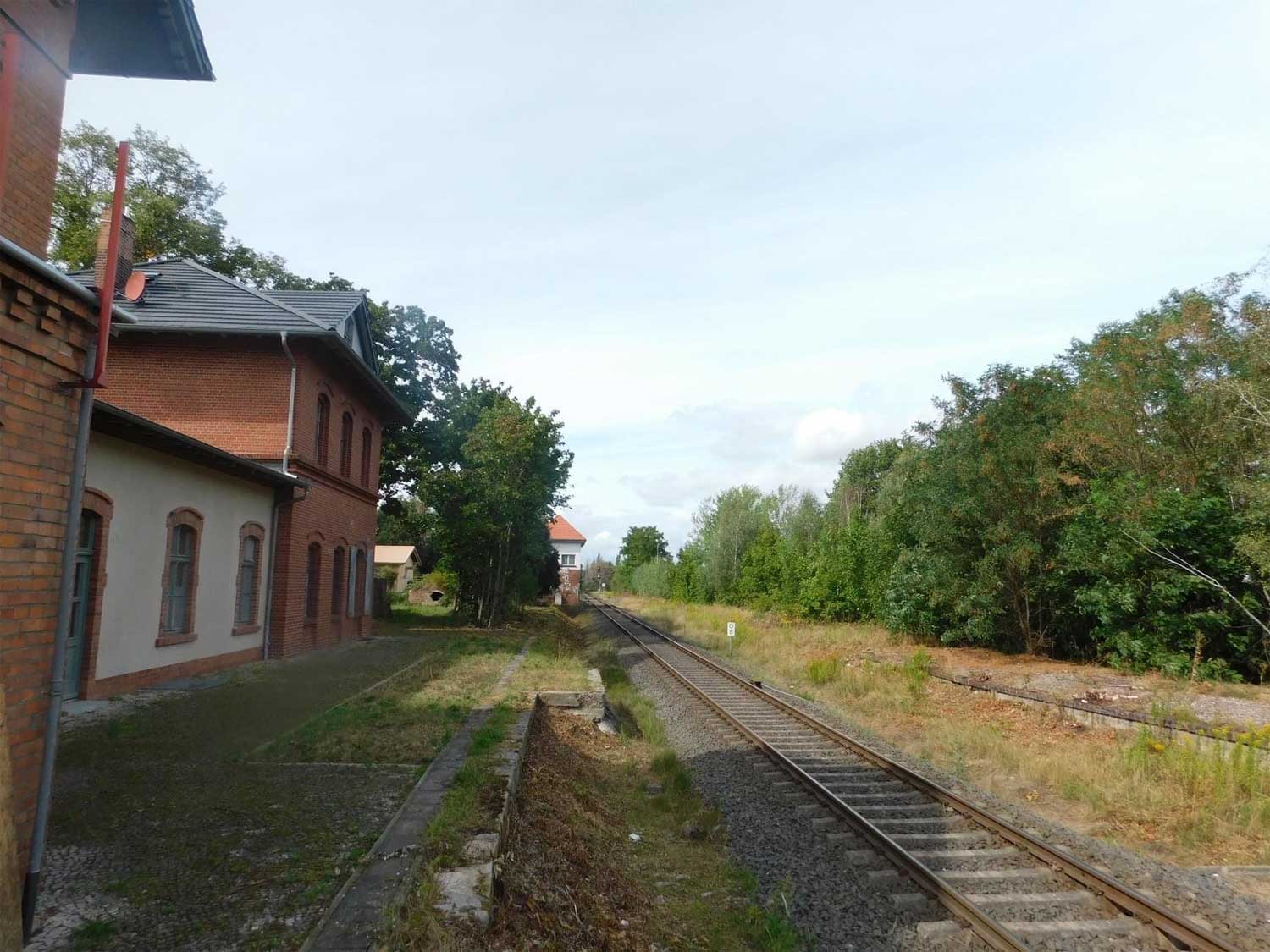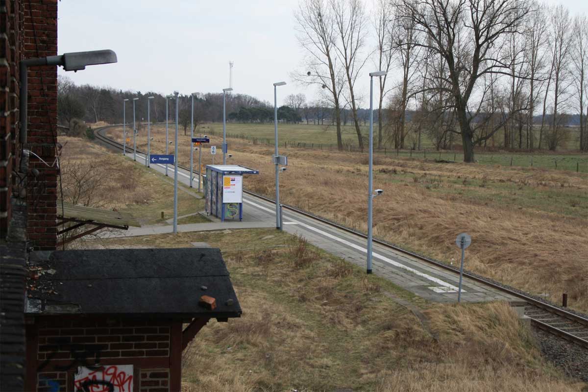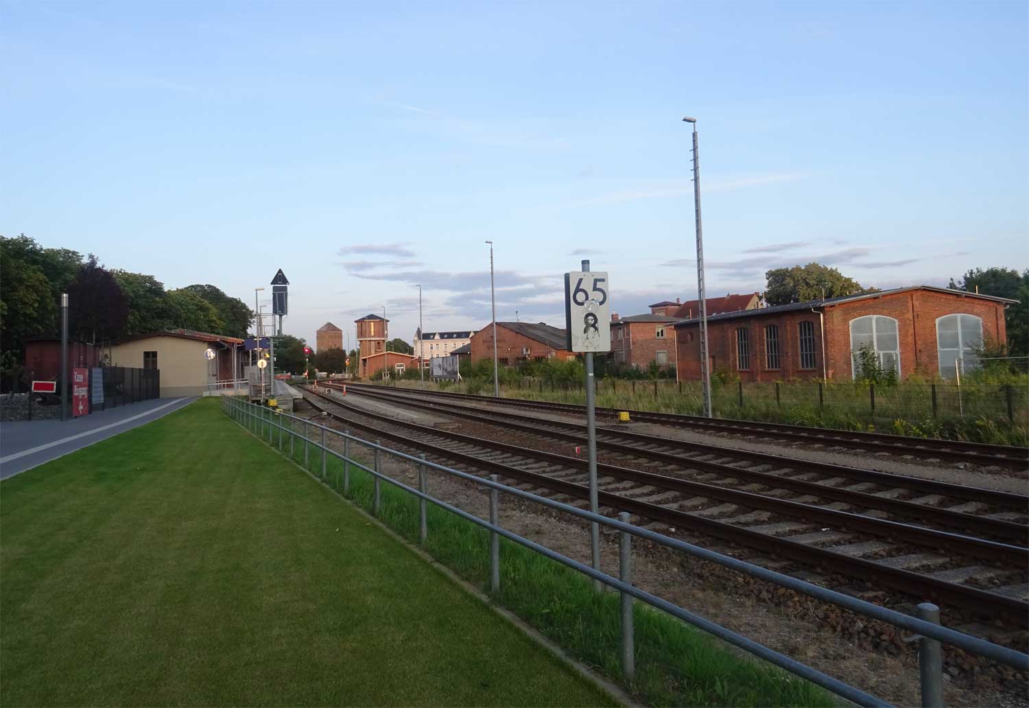 Wittstock (Dosse) | 65,82 | km 55,47 der Strecke Wittenberge 0,0 - Perleberg 10,54 - Pritzwalk 35,41 - Wittstock (Dosse) 55,47 - ehemalige Landesgrenze Preußen/Mecklenburg (bei Buschof) km 73,25 = [km 0,0 - Buschhof 0,15 - Neustrelitz Süd 30,68 - Thurow (Meckl) 38,58 - Streckenunterbrechung bis Strasburg |