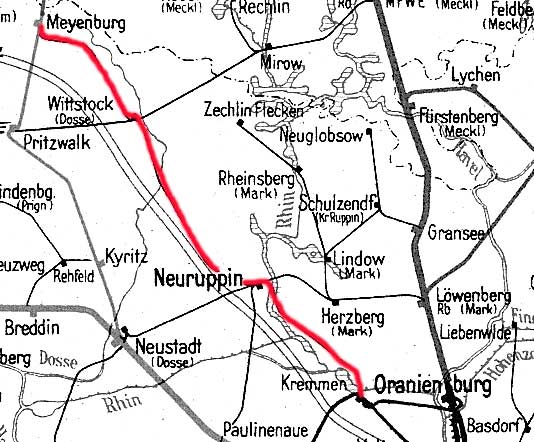 Kremmen 0,0 - Neuruppin Hbf 28,61 - Wittstock (Dosse) 65,82 - Meyenburg 93,085