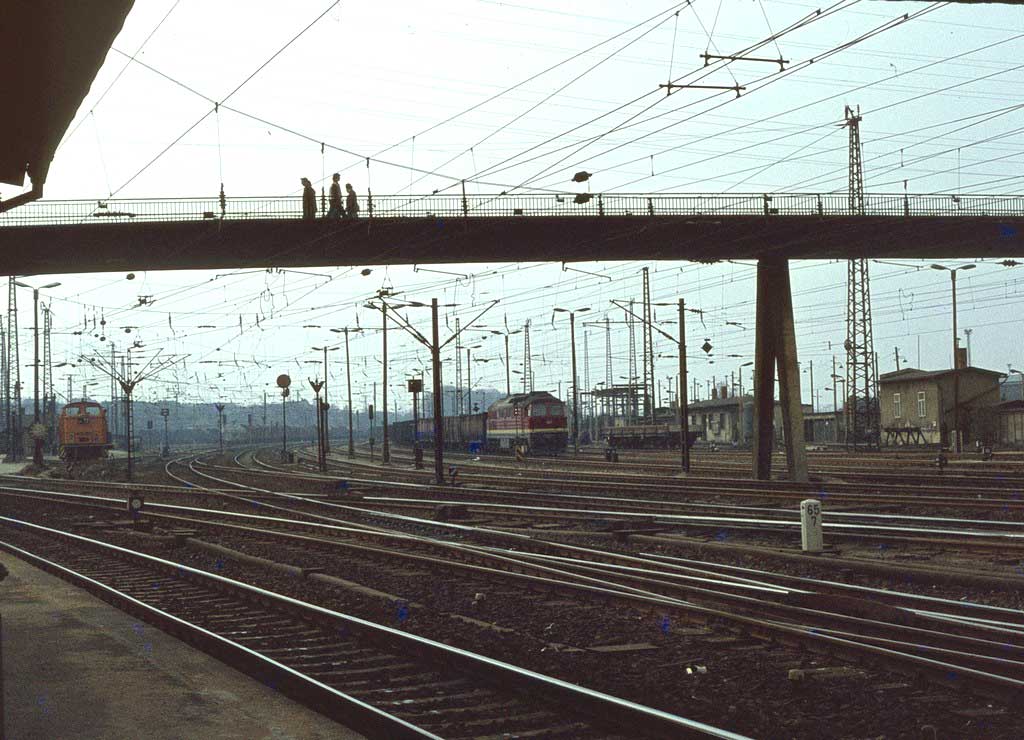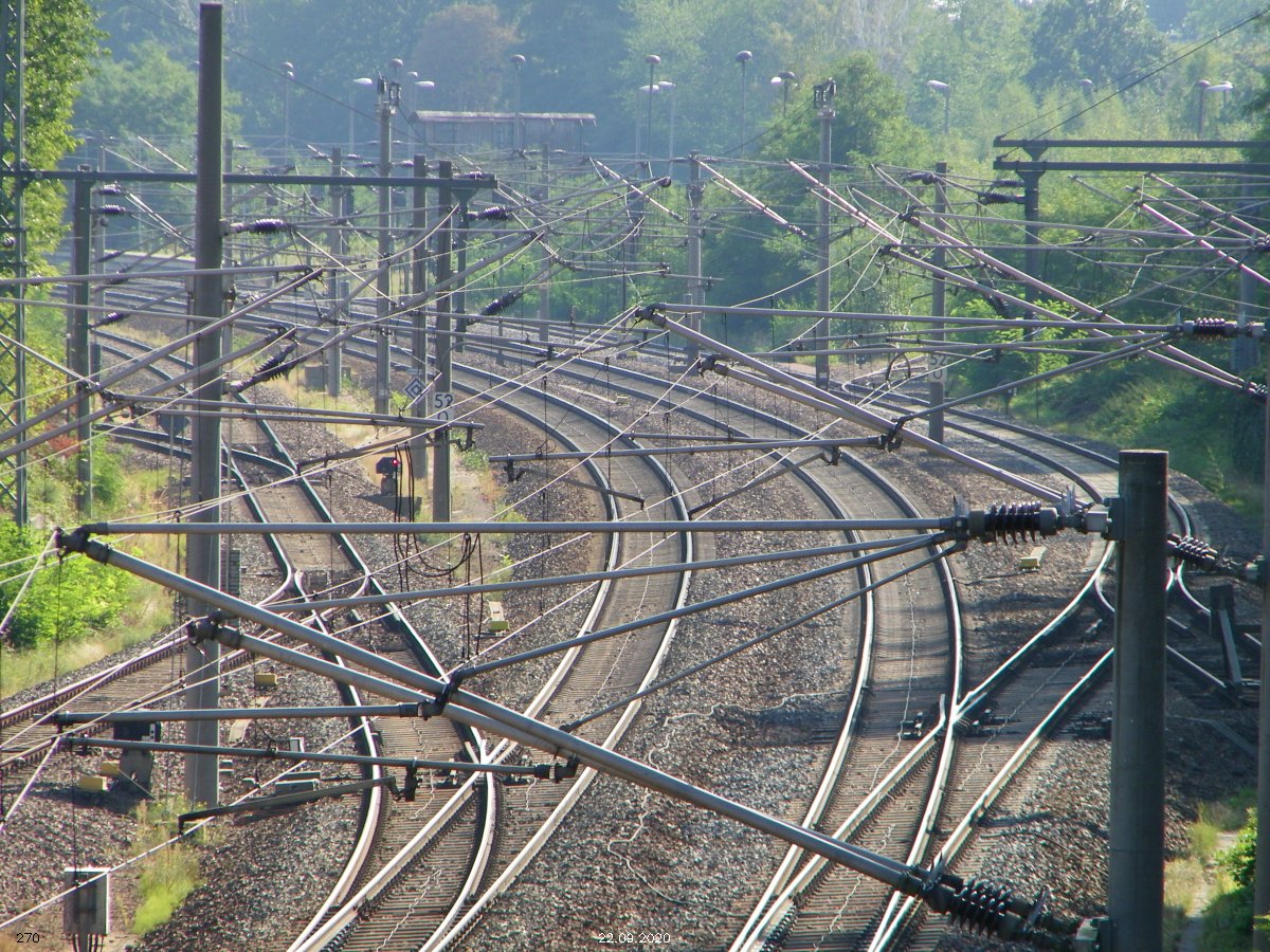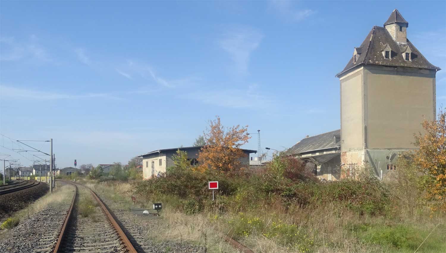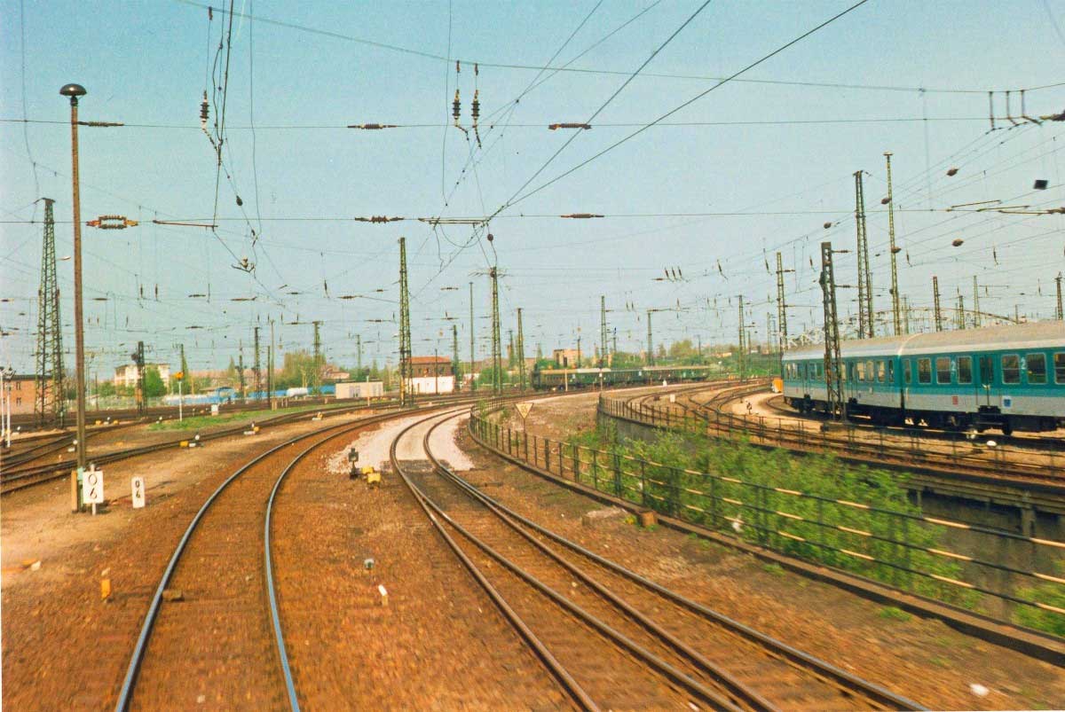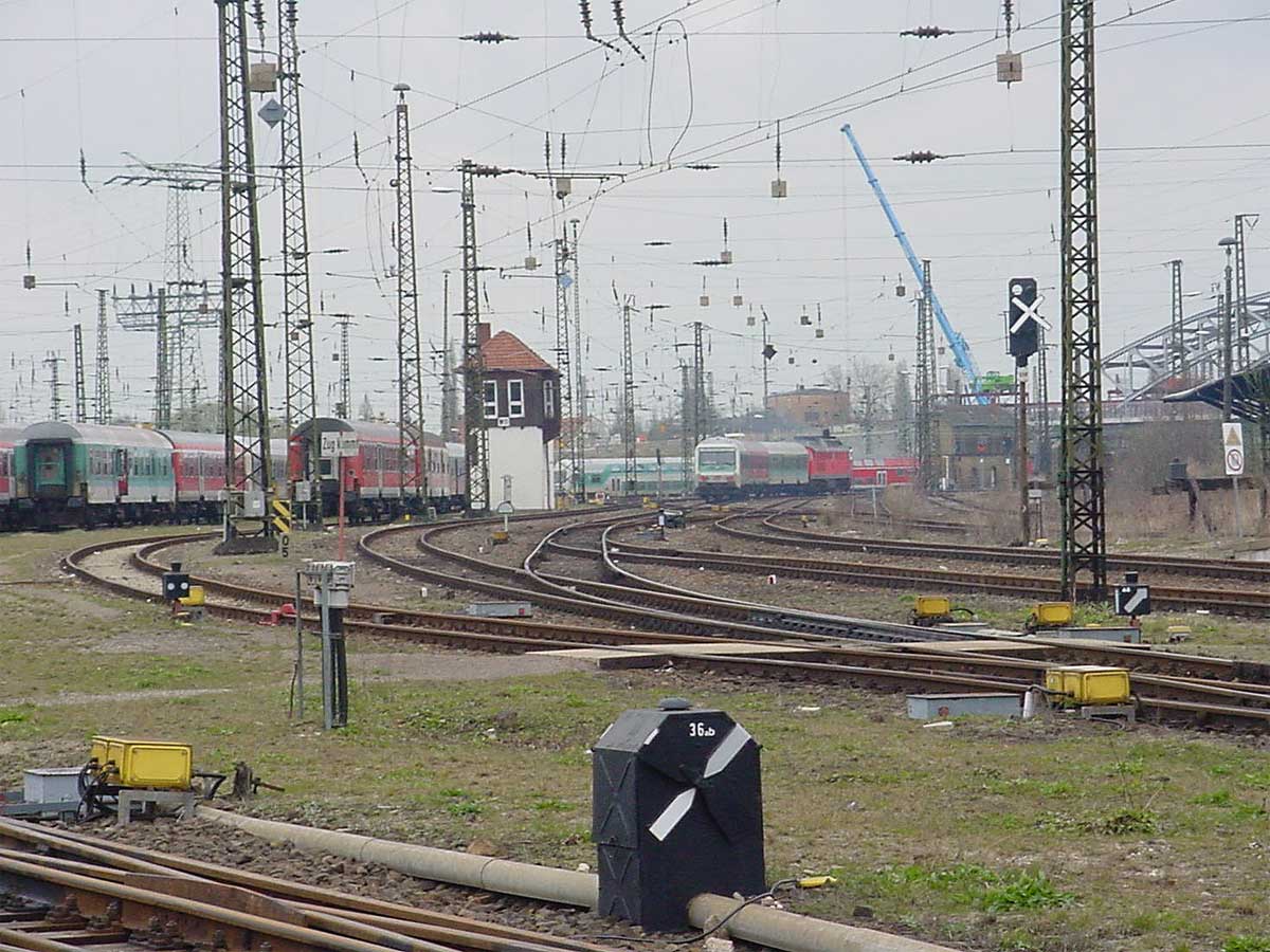 Ganz links zwei Bahnhofsgleise und links anschließend