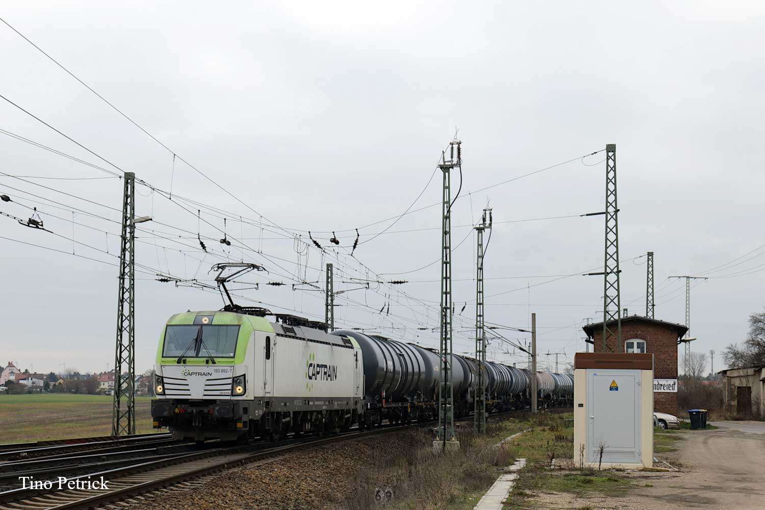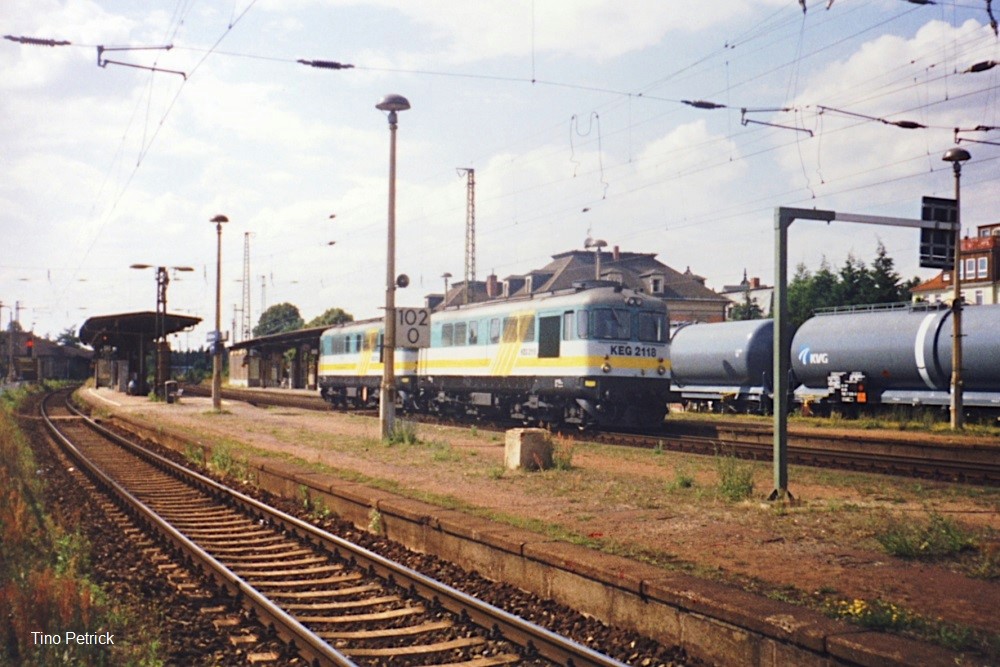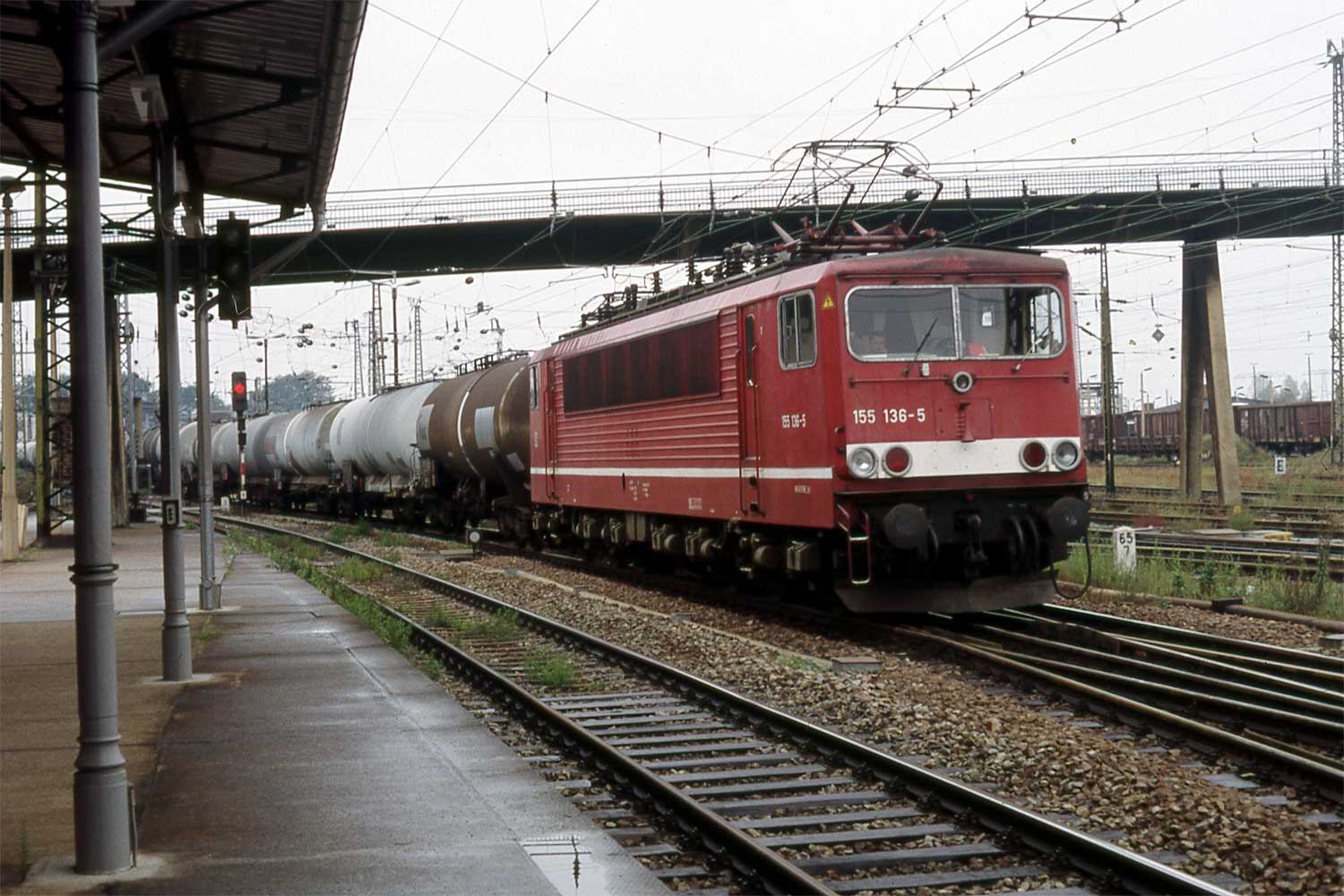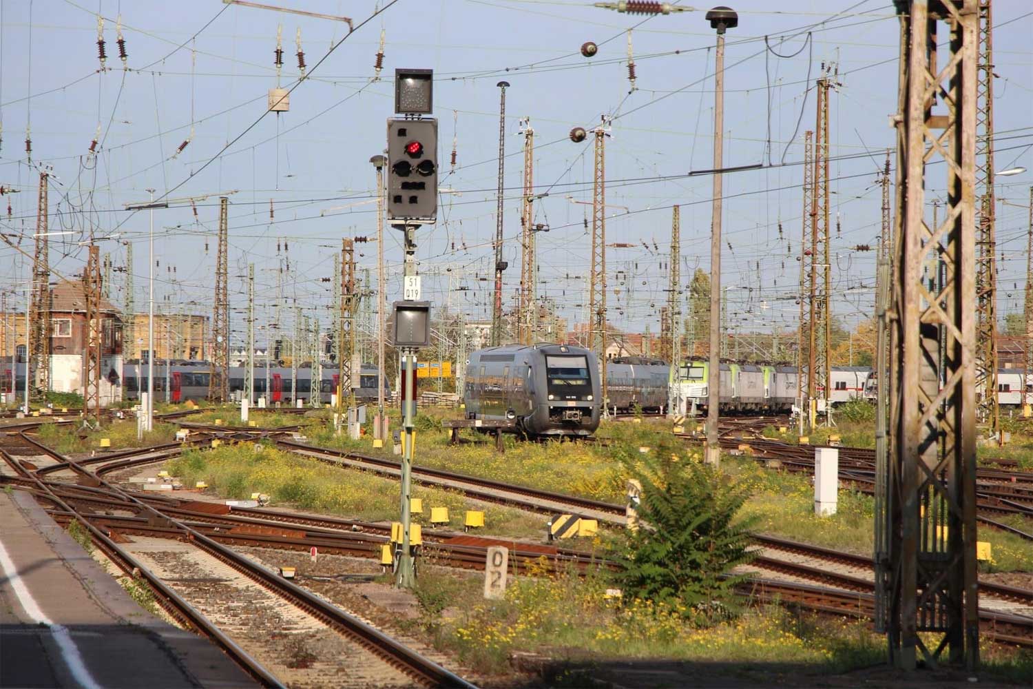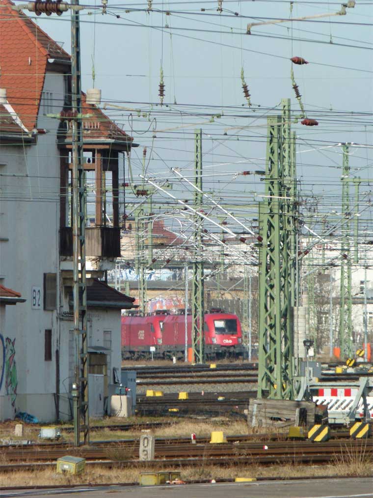 Ganz links zwei Bahnhofsgleise und links anschließend