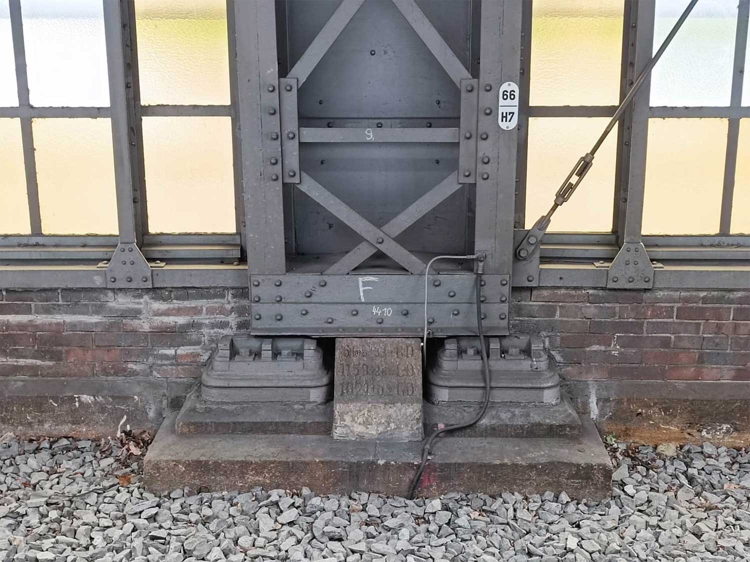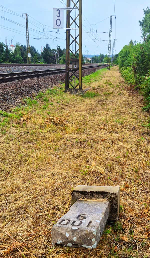 Am westlichen Fußpunkt des Bogens 10 der Bahnhofshalle befindet sich ein besonderer Hektometerstein (Der Standort ist nicht korrekt!):