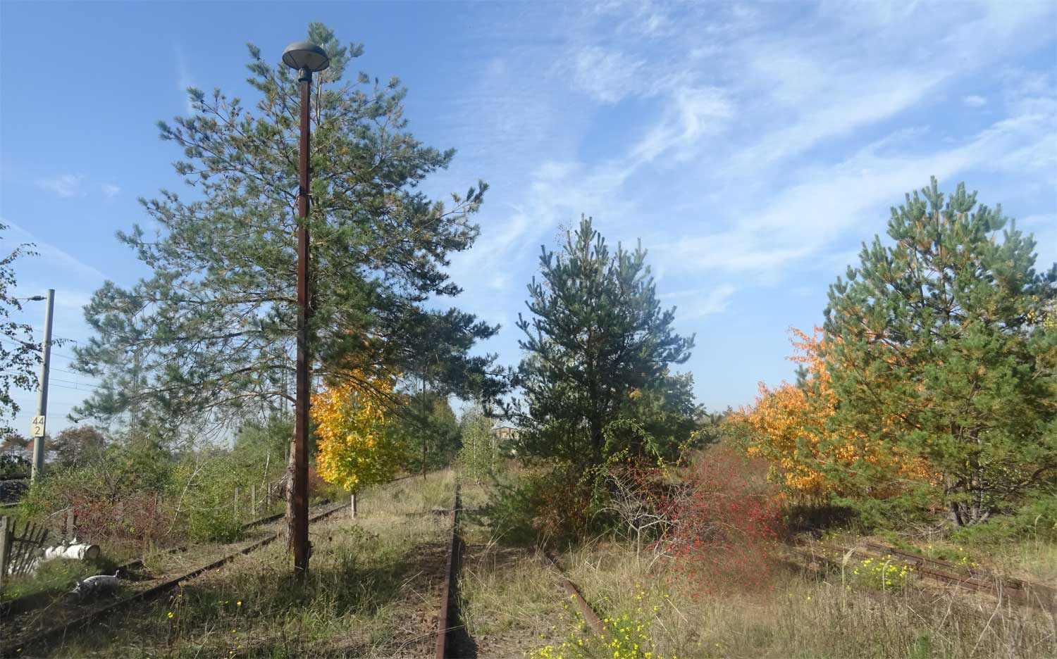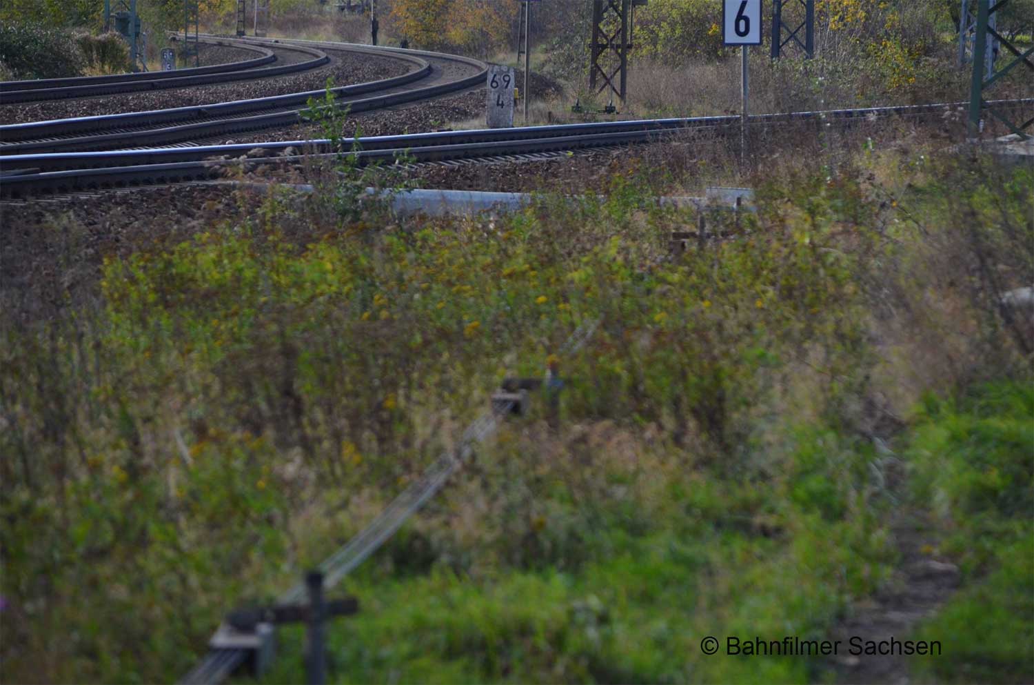 Ganz links Anschluss Schwellenwerk Coswig, das Gleis gerade aus weiter verläuft in Richtung der ehem. Ziegelei (?), ist aber abgetrennt.