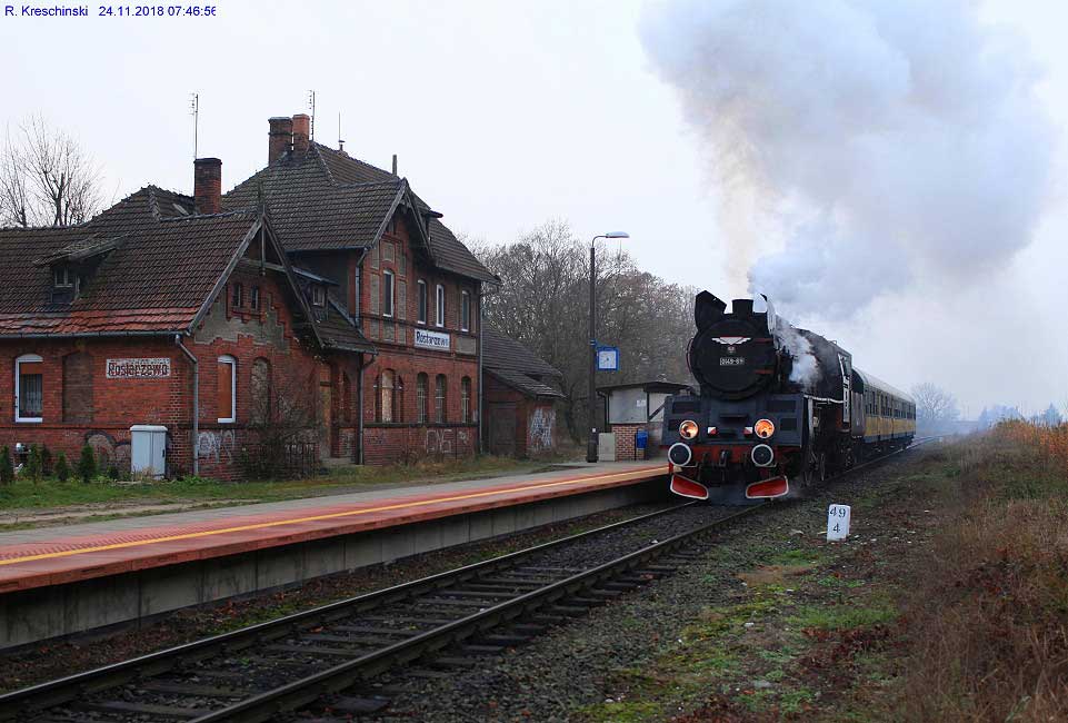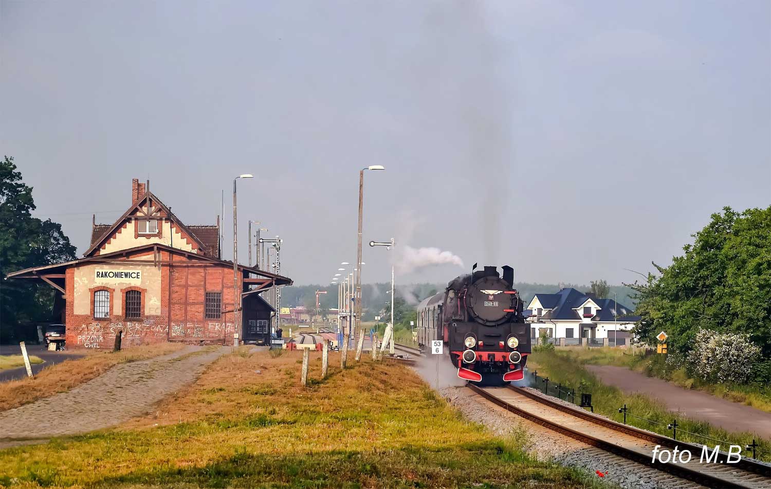 Rakwitz (Bz Posen) | 14,62 | km 0,0 der Strecke Rakwitz (Warthel) 0,0 - Altboyen 30,6 - Kriewen 48,6 (Schmiegeler Eisenbahn) Spurweite 1000 mm (ab 1952 Umspurung auf 750 mm) |