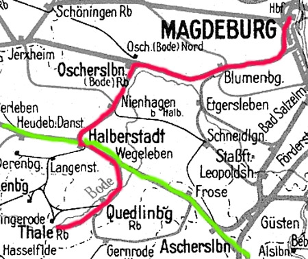 Oschersleben (Bode) Reichsb | 38,24 | km 65,65 der Strecke (Braunschweig Hbf 0,0) - Wolfenbüttel 11,76 - Jerxheim 22,07 (später: 22,26) - Oschersleben (Bode) Reichsb 65,65 |