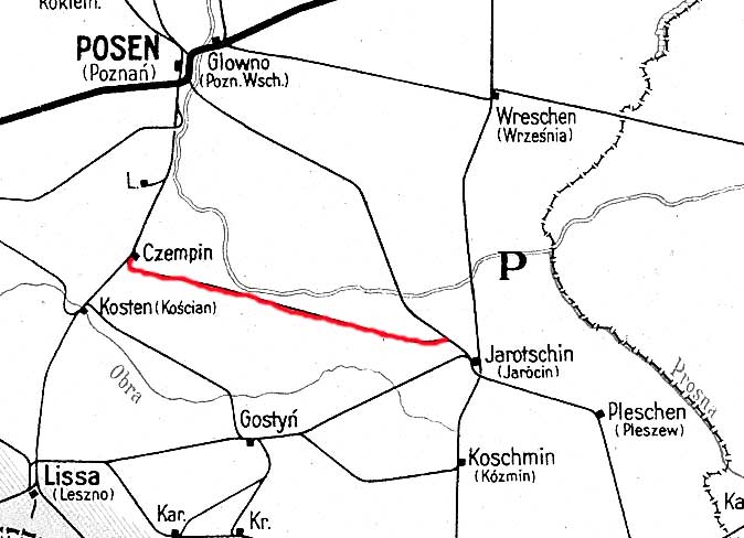 Czempin | 0,0 | km 133,01 der Strecke Breslau Hbf 0,06 - Lissa 95,87 - Posen Hbf 164,53 - Kreuz 248,23 - Arnswalde 303,24 - Stargard (Pom) 337,80 |