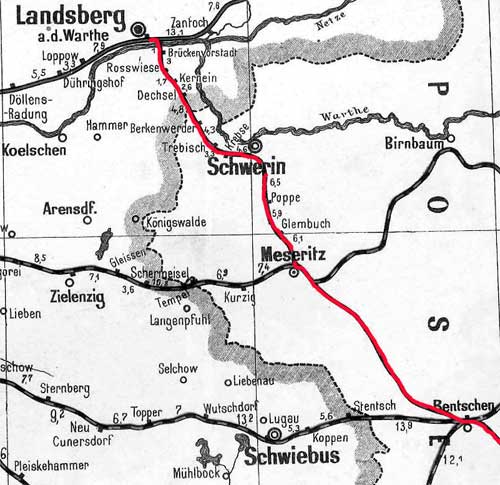 Lissa (Posen) 0,0 - Wollstein (Posen) 46,08 - Bentschen 68,79 - Meseritz 100,04 - Schwerin (Warthe) 119,14 - Landsberg (Warthe) 144,43 (1918)