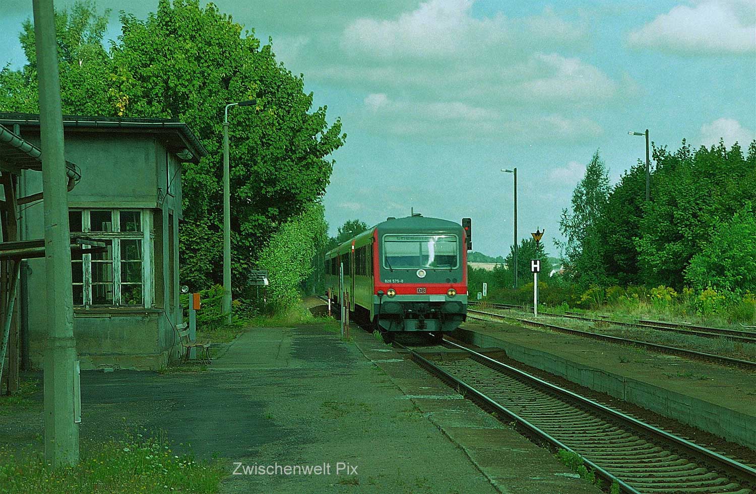 Bf Borna (b Leipzig) mit km 7,0 - 143 048 mit einer S-Bahn aus Leipzig im Sommer 2002