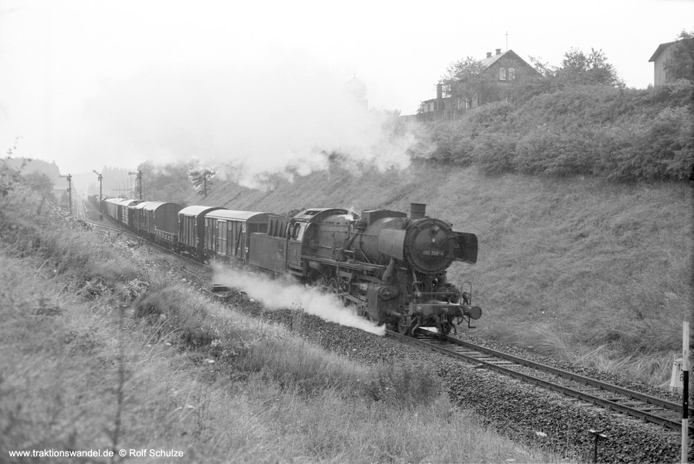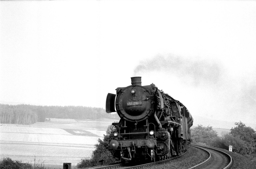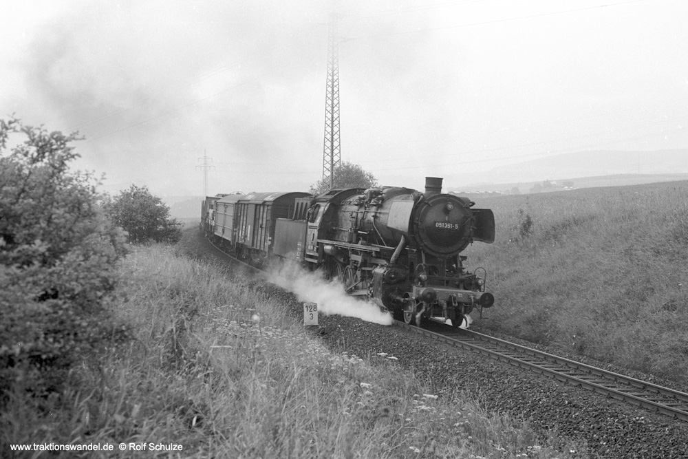 051 210 vom Bw Kirchenlaibach mit ihrem Güterzug am km 94,8