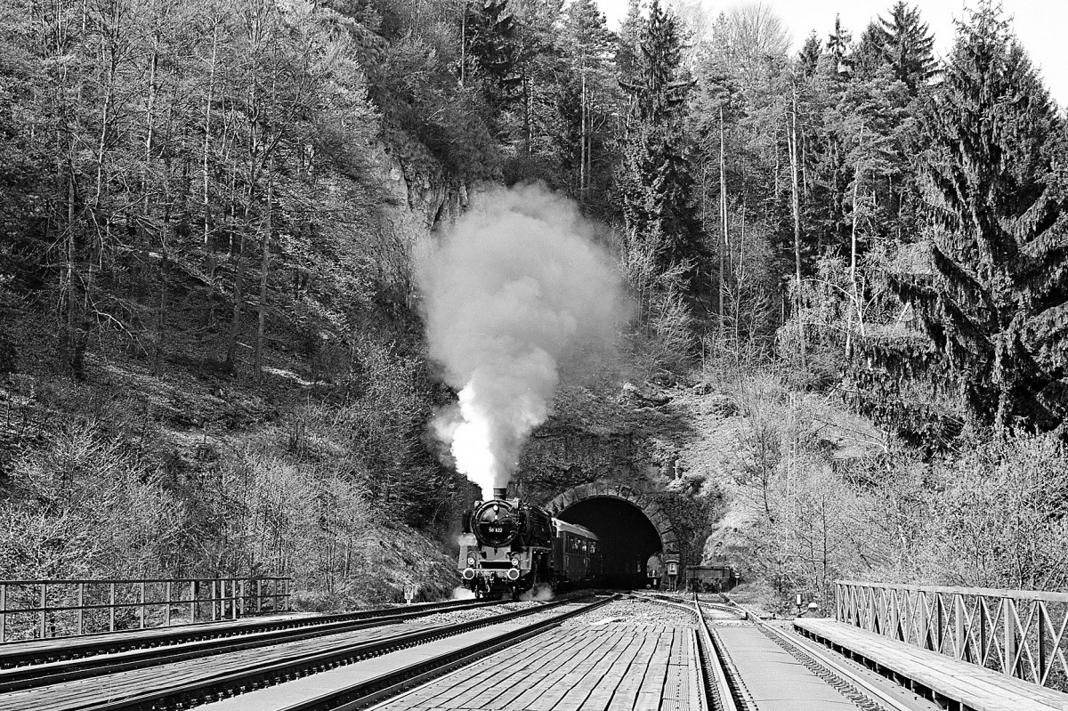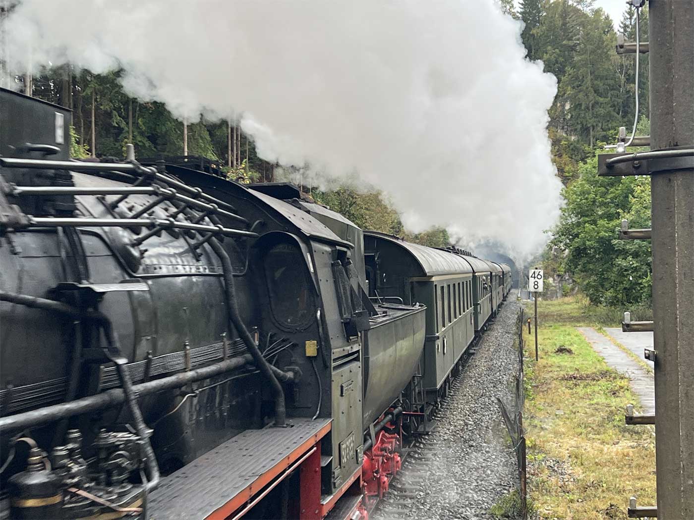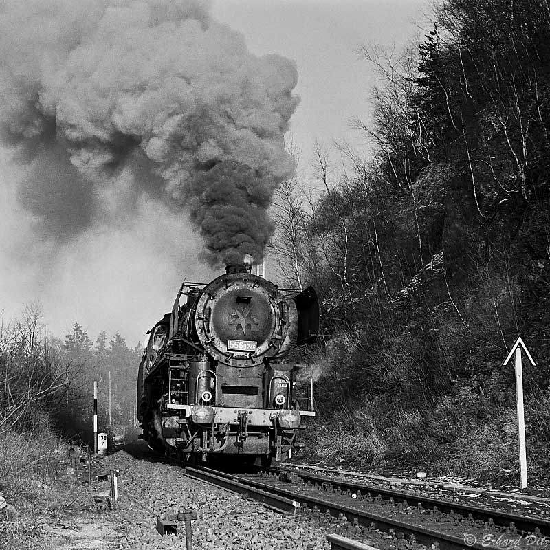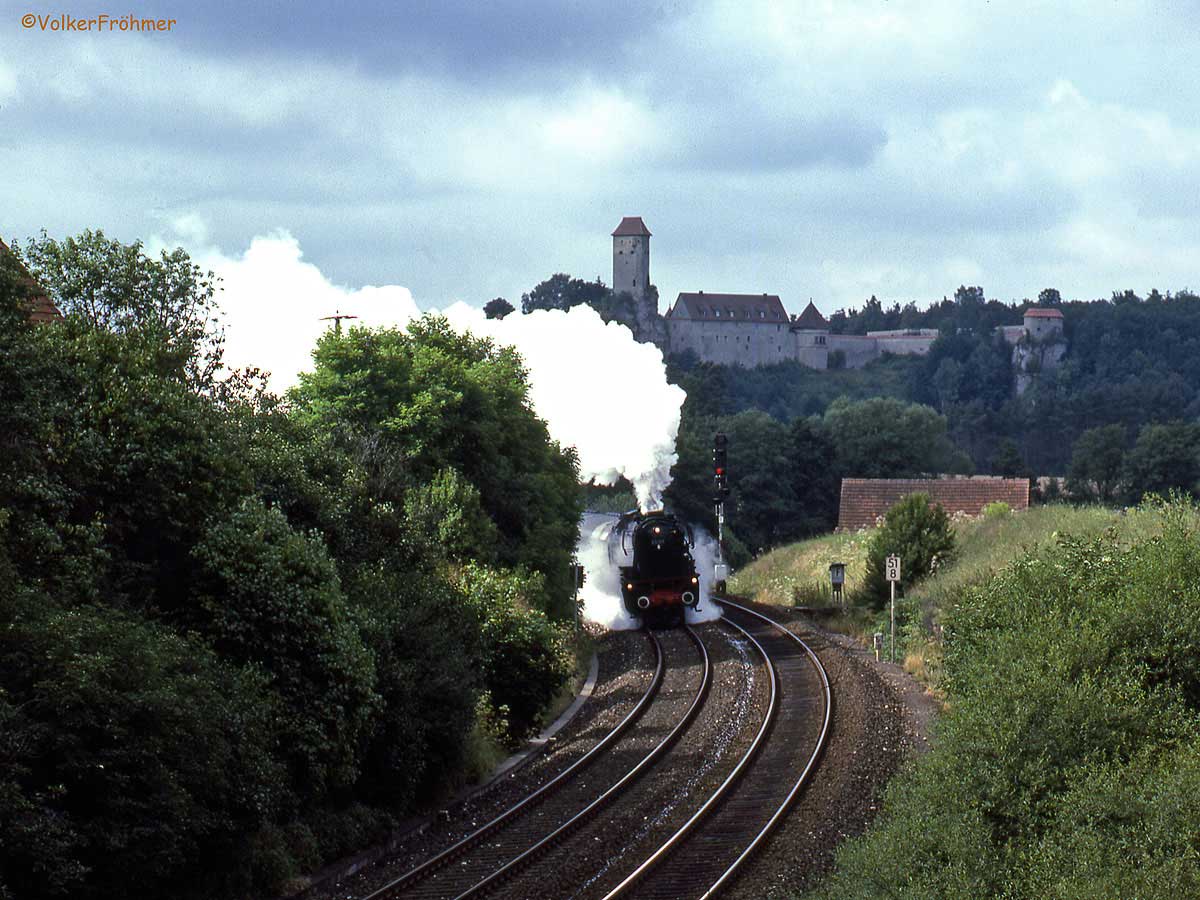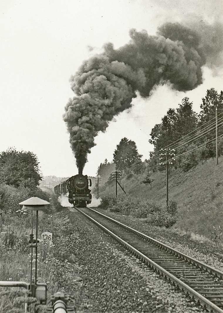 064 295 mit einer großen Rauchfahne bei der Ausfahrt Bf Kirchenlaibach mit km 93,5