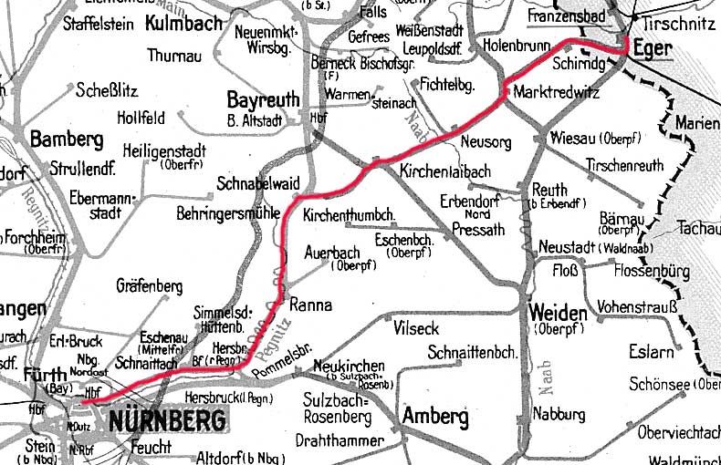 Nürnberg Hbf 0,0 - Schnabelwaid 74,96 - Marktredwitz 124,20 - Schirnding 138,30 - Grenze 140,584 - Eger 151,467