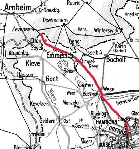 Oberhausen Hbf 0,0 - Wesel 26,62 - Emmerich 60,84 - Staatsgrenze Deutschland/Niederlande 72,613 (auch Angabe: 72,632) (km 66,8 von 1949 - 1963 niederländische Auftragsverwaltung) - (km 111,0 - Arnheim)