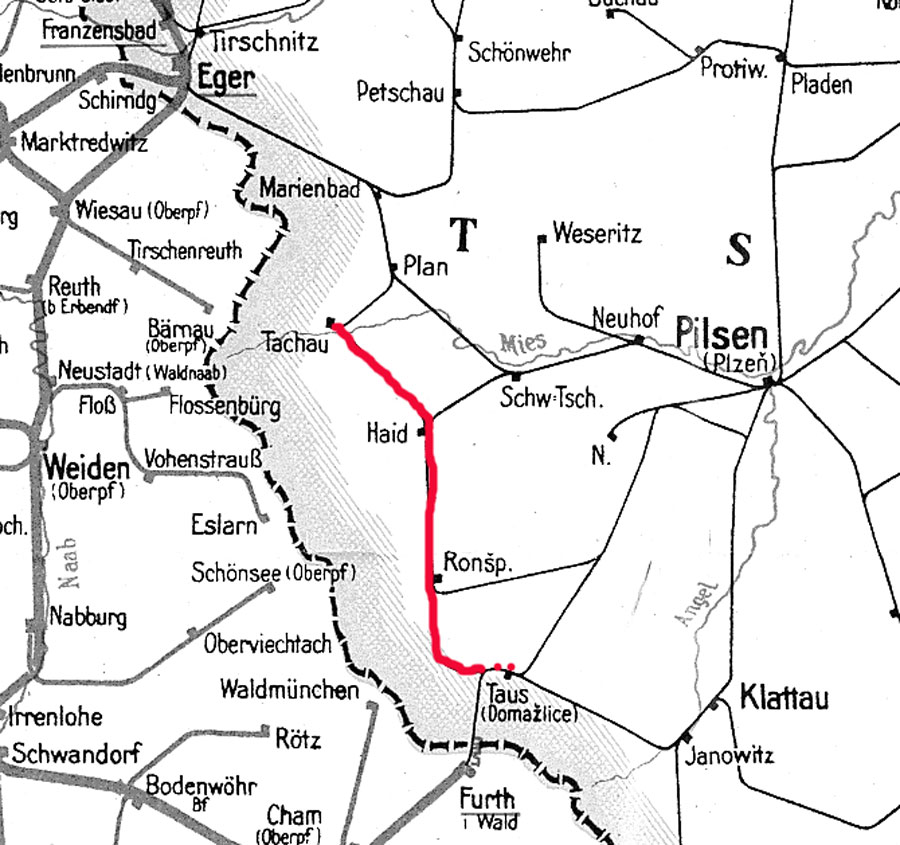 (Taus / Domažlice 0,0) - Pasečnice 5,864 - Hawlowitz / Havlovice 6,127 - Grenze Protektorat Böhmen und Mähren/Sudetengau 6,2 - Ronsperg 21,353 - Haid (b Tachau) 57,218 - Tachau 75,570