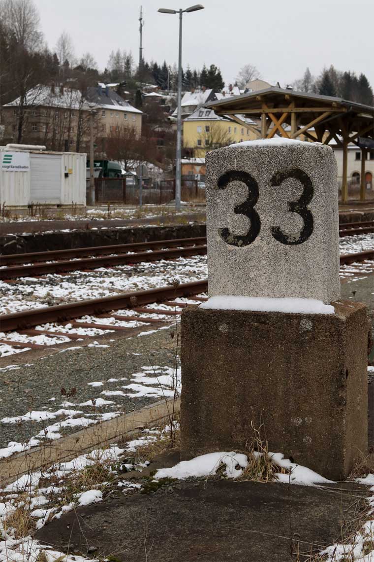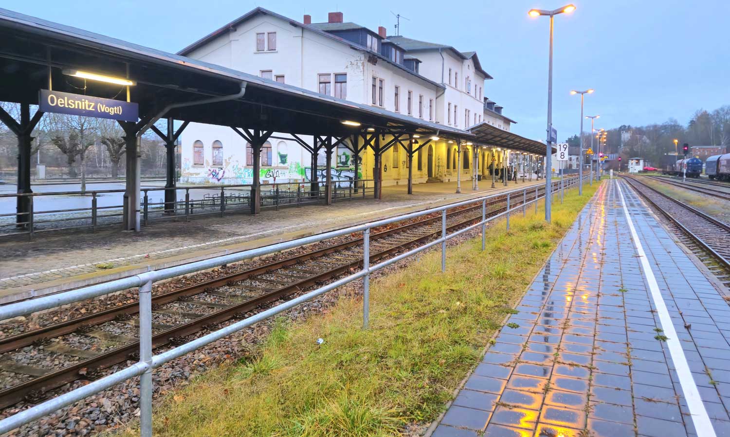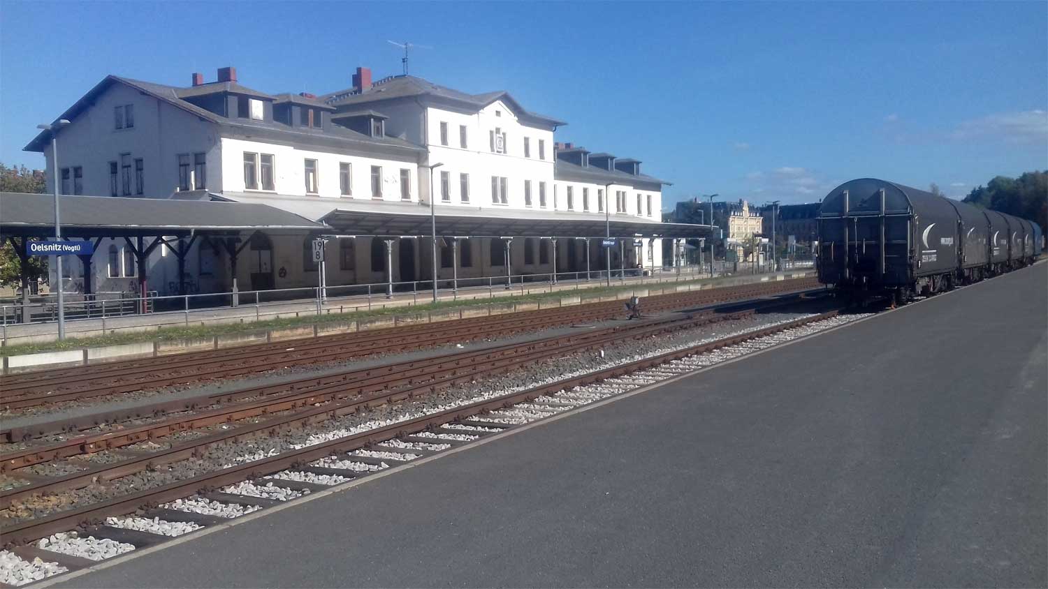 Oelsnitz (Vogtl) 19,831 km 47,29 der Strecke Herlasgrün 0,22 - Falkenstein (Vogtl) 22,27 - Streckenunterbrechung - [Oelsnitz (Vogtl) 47,293] (HOe)