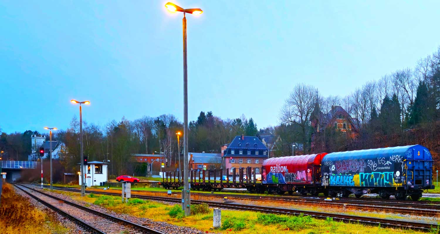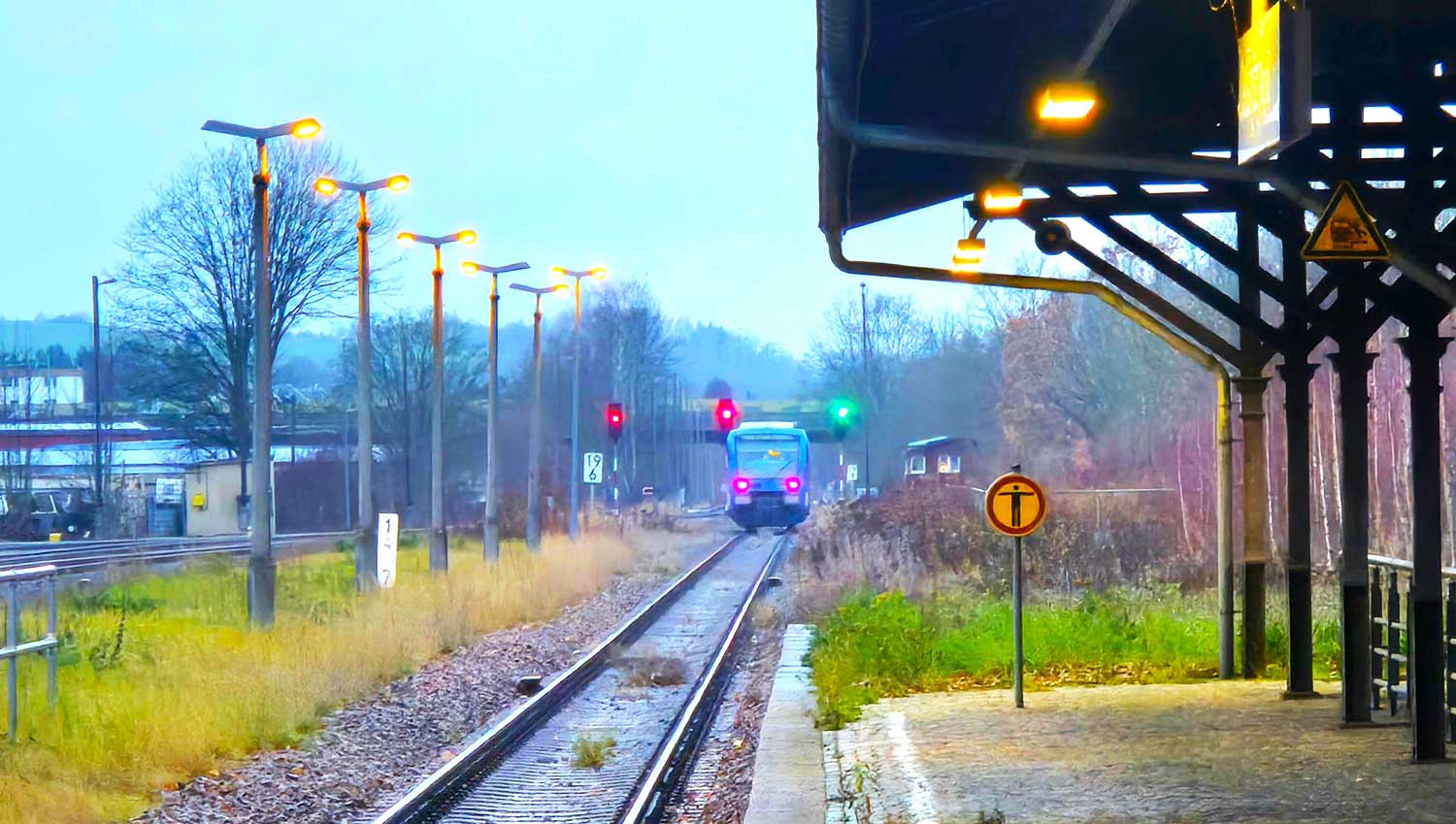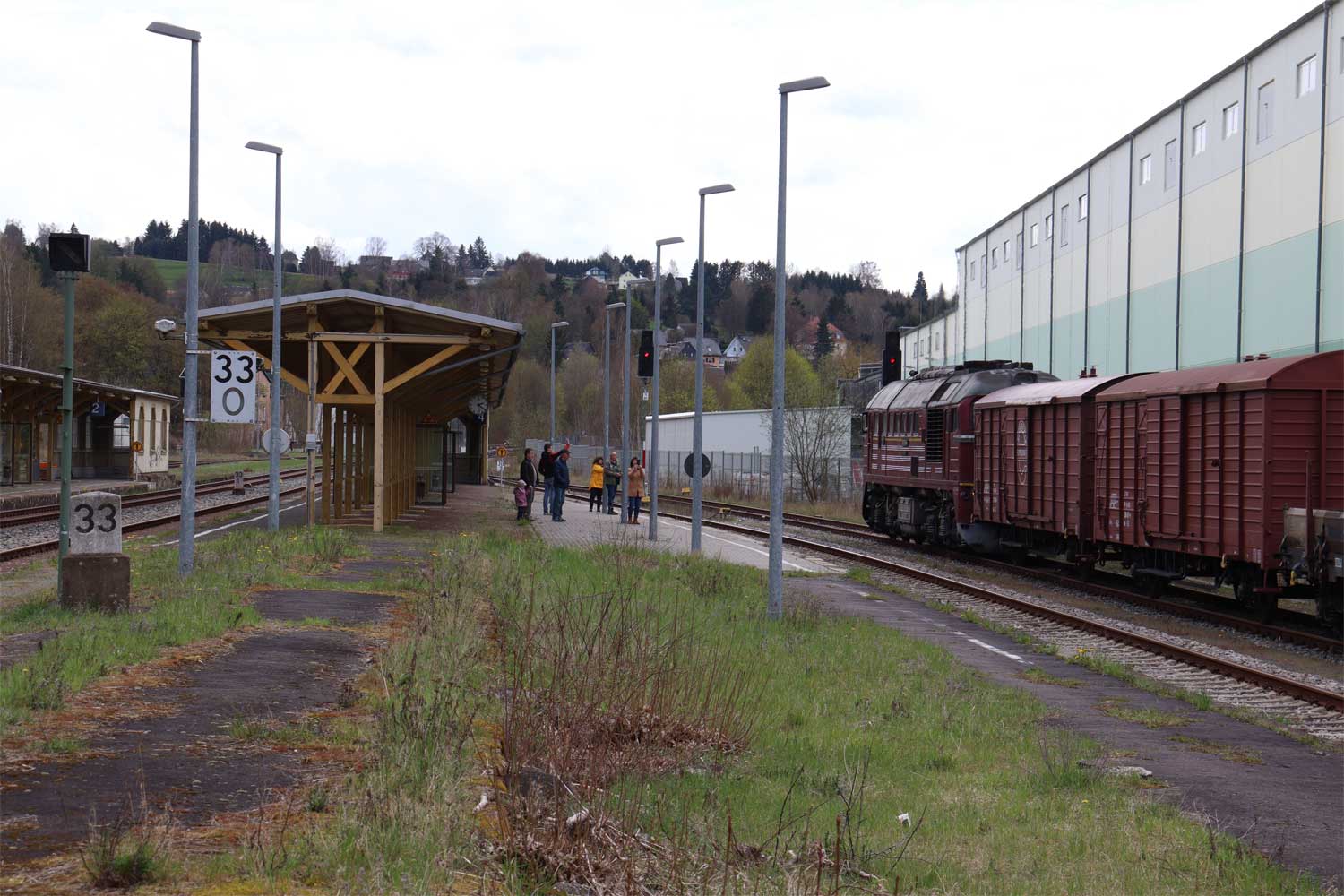 Oelsnitz (Vogtl) 19,831 km 47,29 der Strecke Herlasgrün 0,22 - Falkenstein (Vogtl) 22,27 - Streckenunterbrechung - [Oelsnitz (Vogtl) 47,293] (HOe)