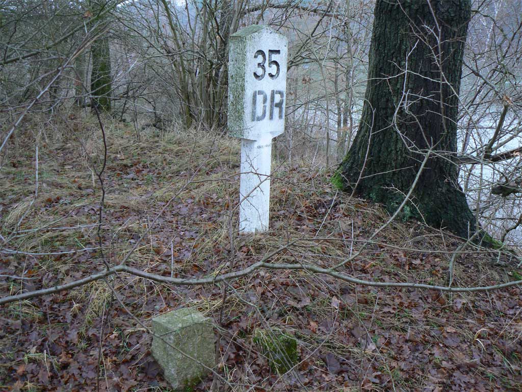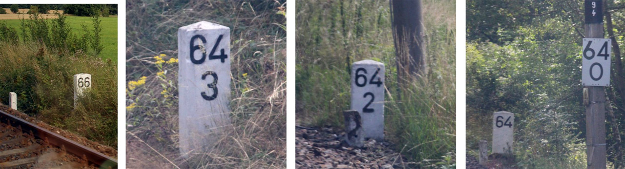 km 63,0 (Tafel und Stein); km 63,1 (Stein) und km 63,2 (Stein) zwischen Vojtanov (Voitersreuth) und Františkovy Lázně (Franzensbad)