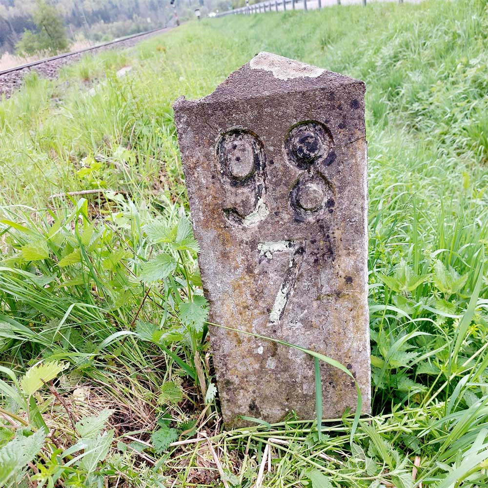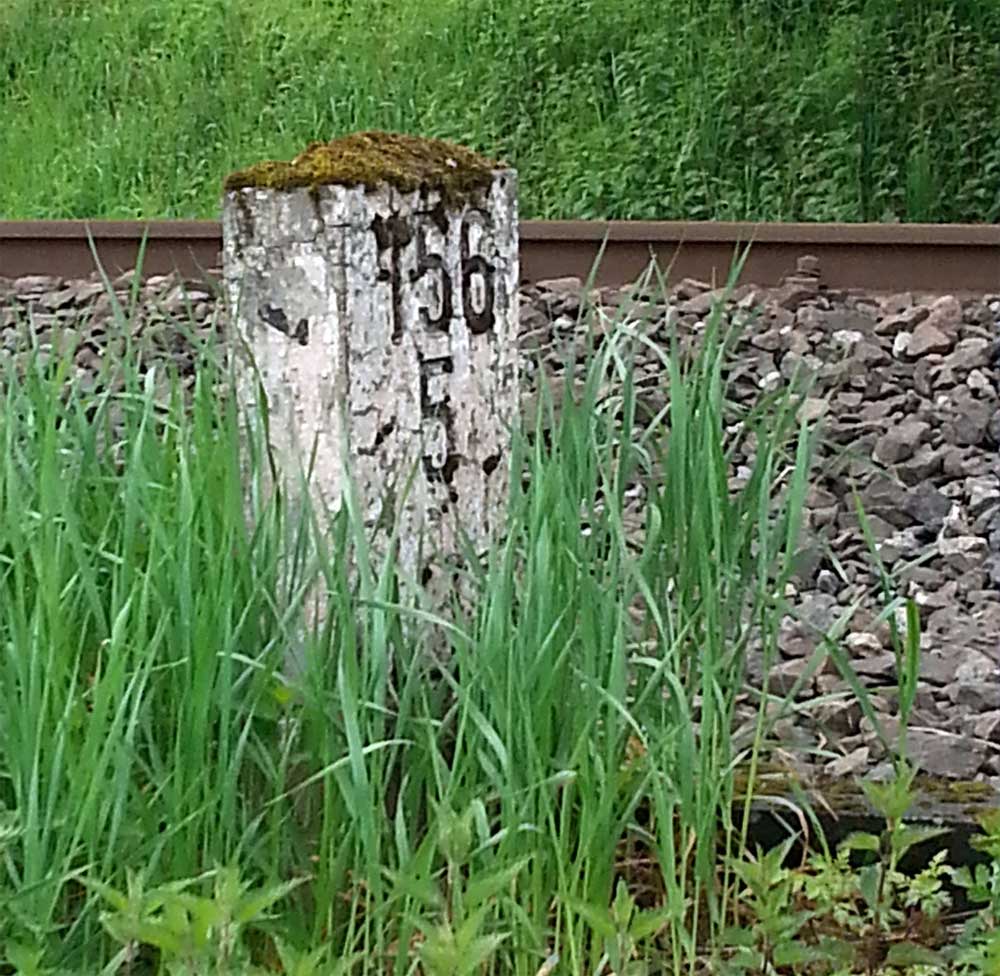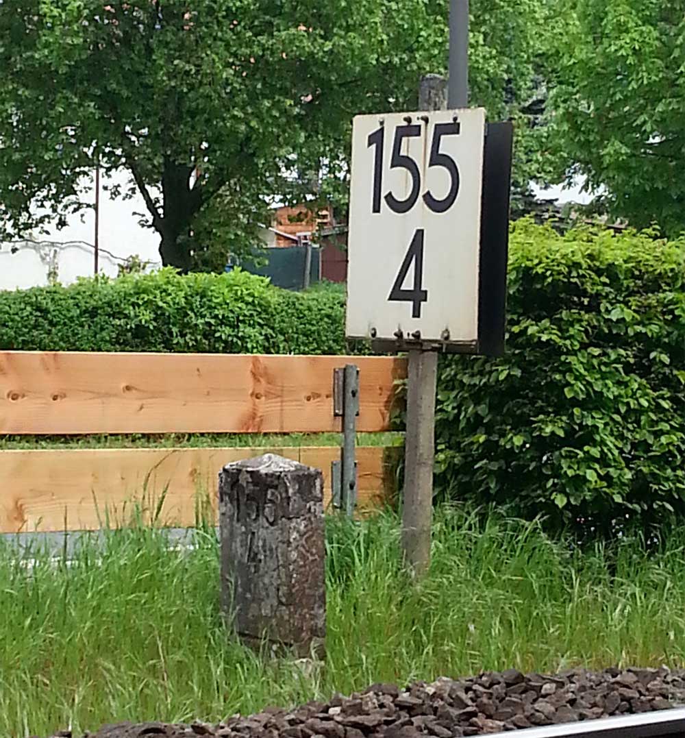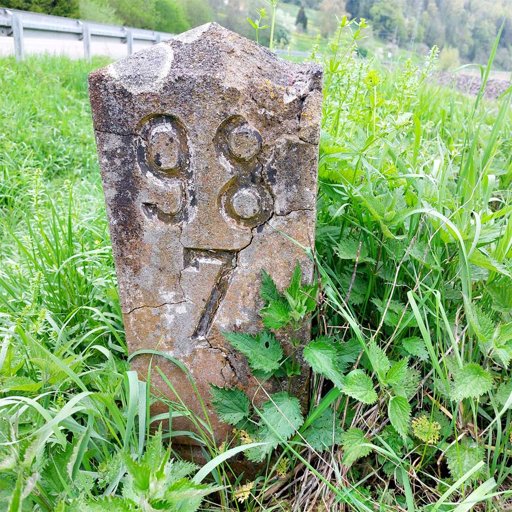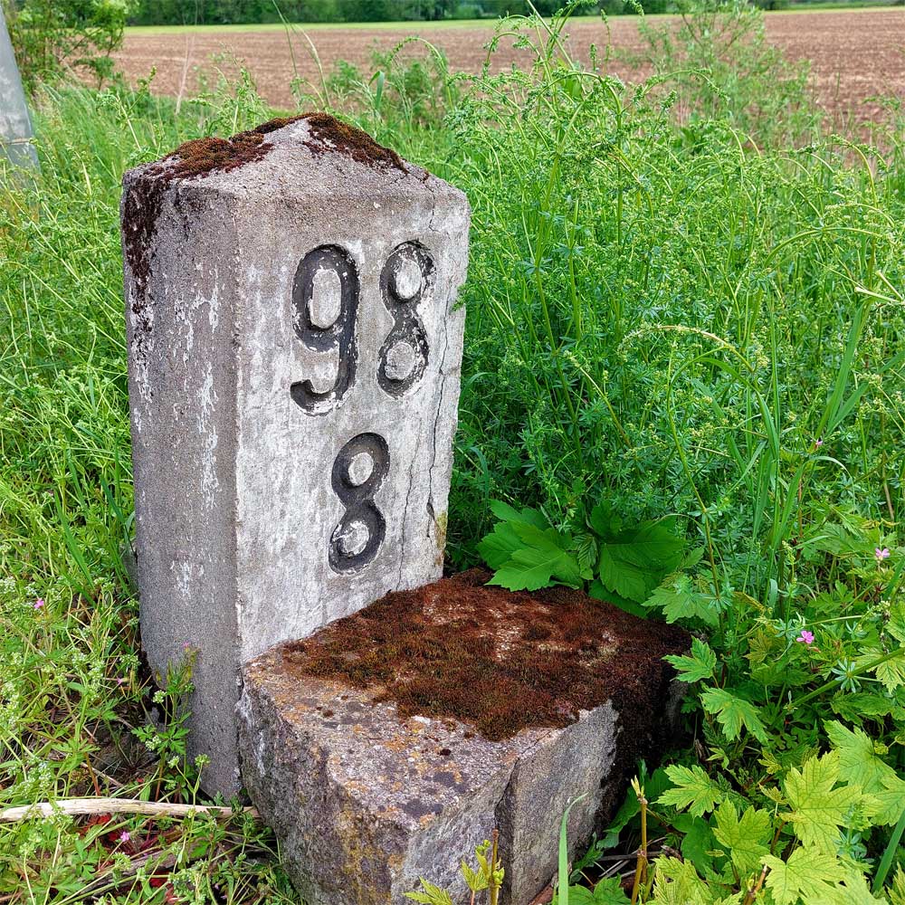 Am linken Bildrand ist ein Kilometerstein zu erkennen.