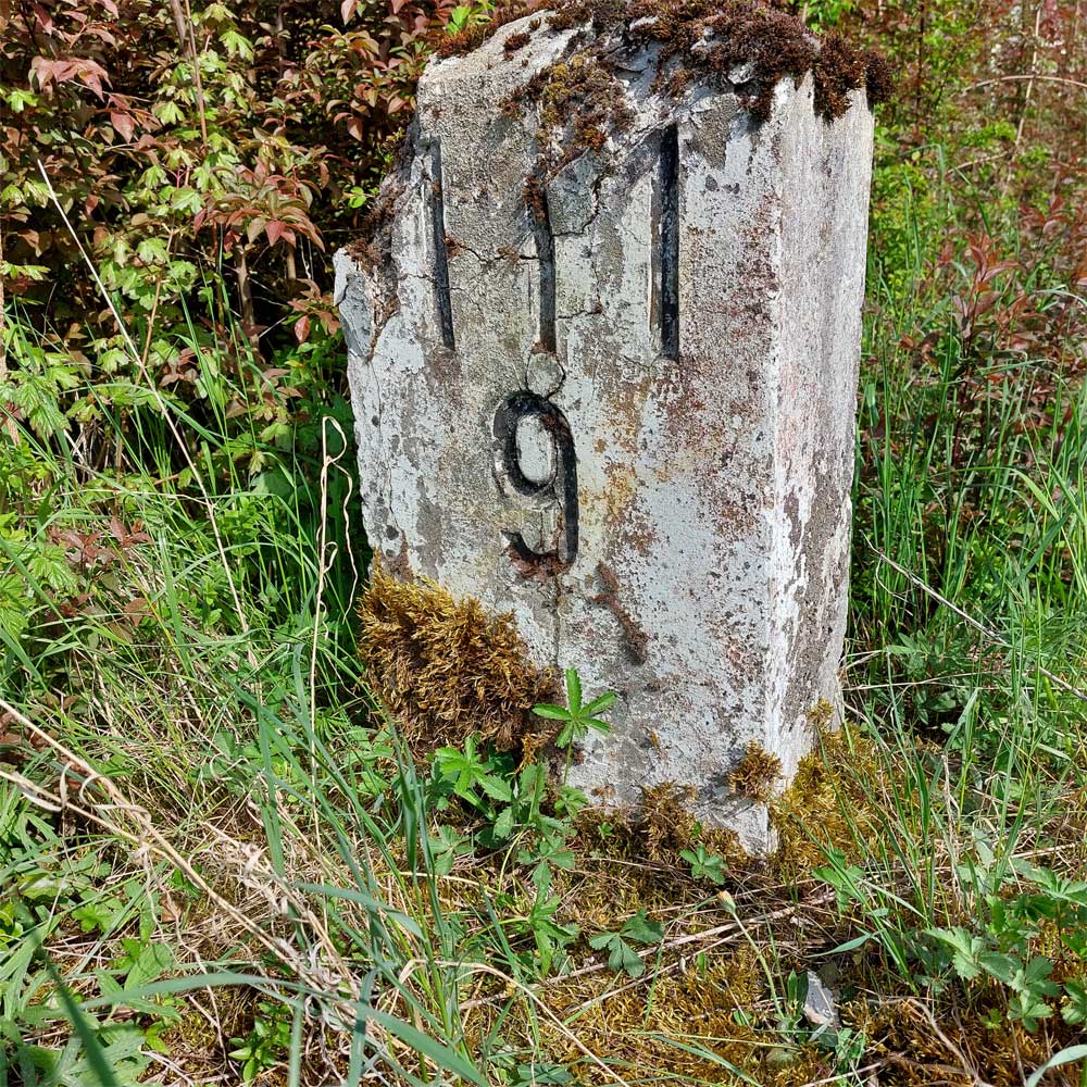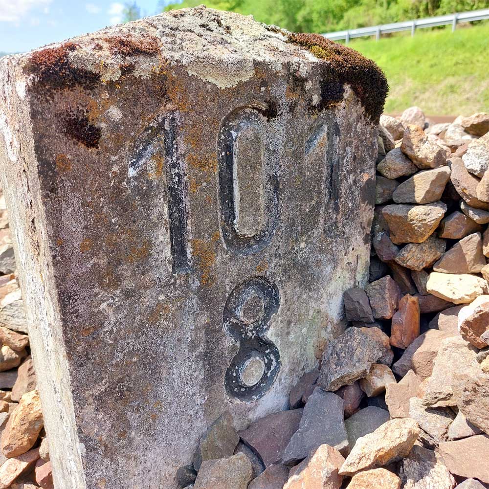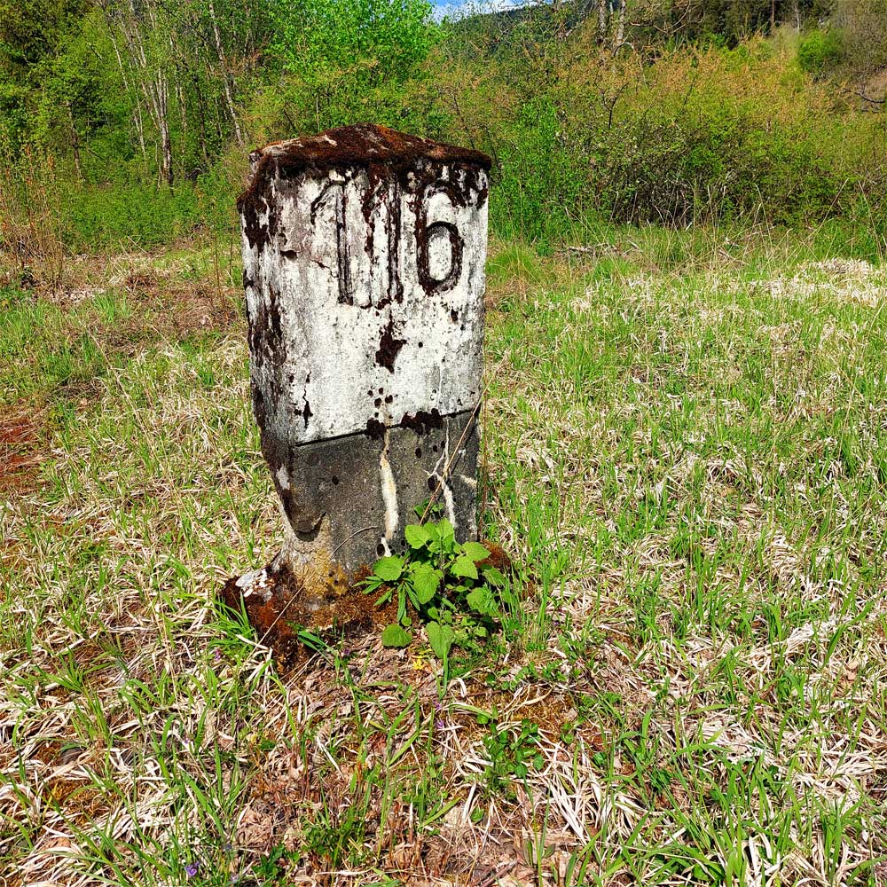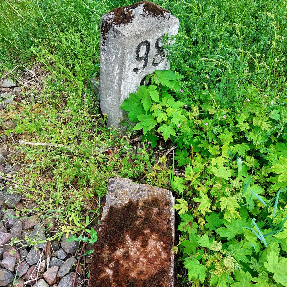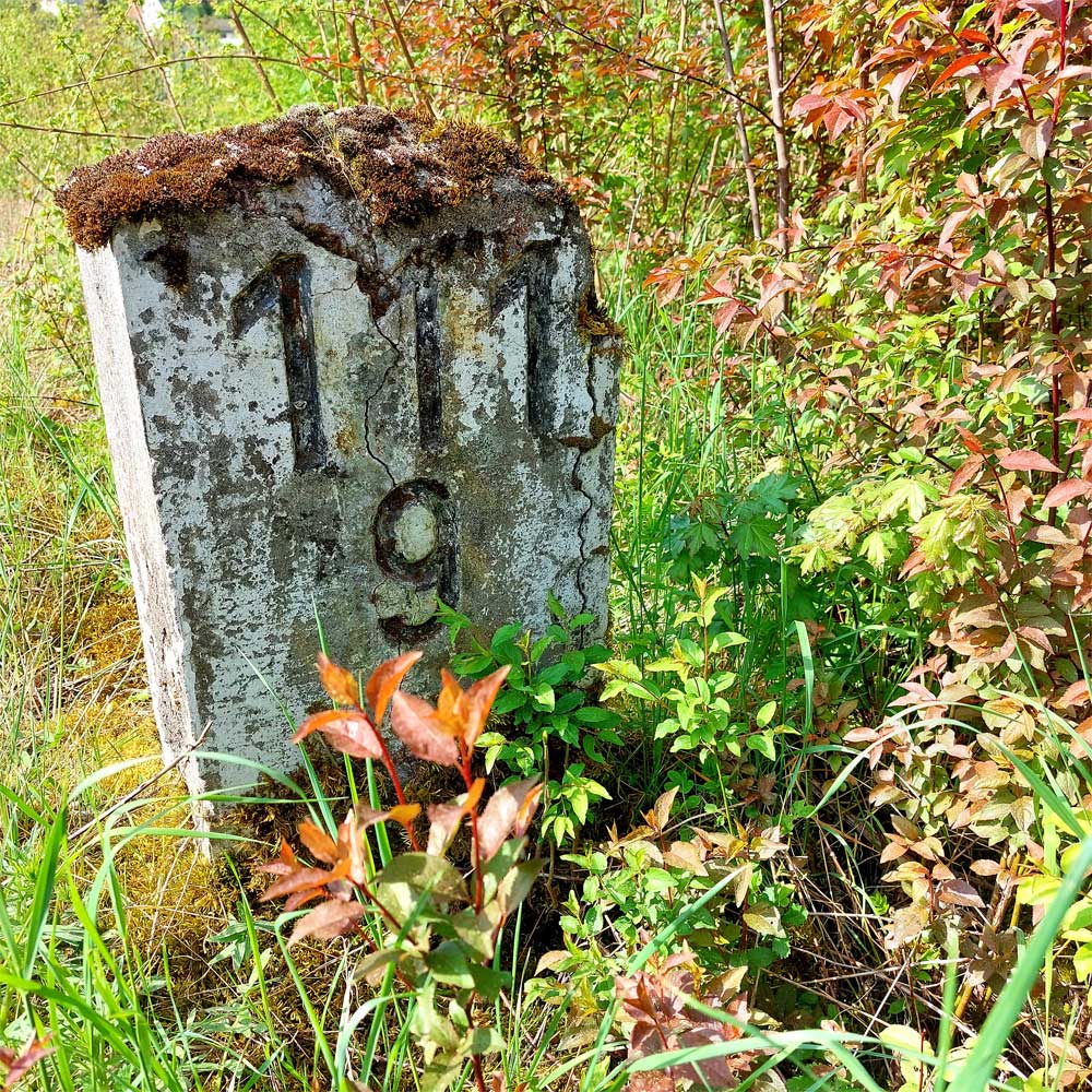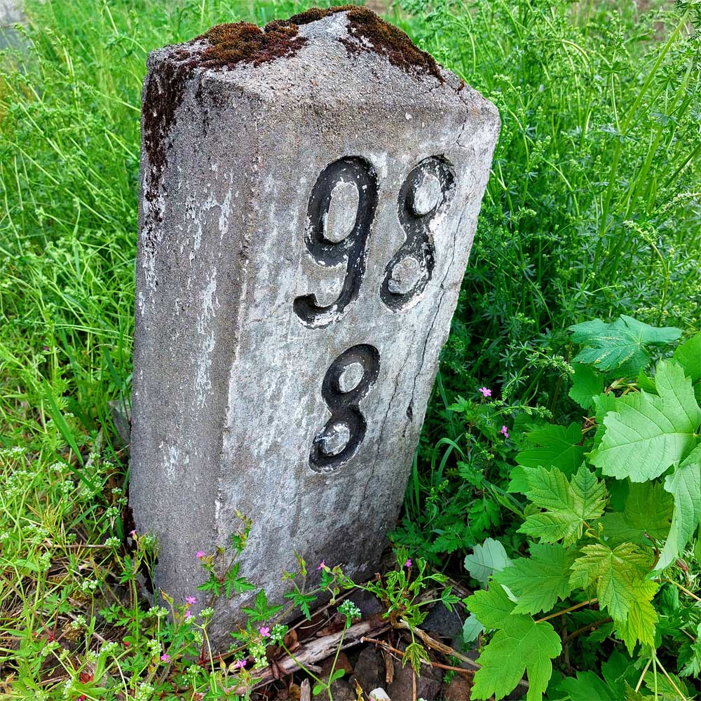 Am linken Bildrand ist ein Kilometerstein zu erkennen.