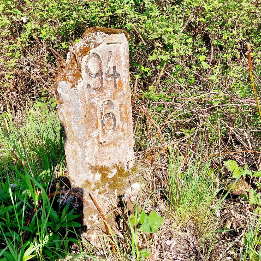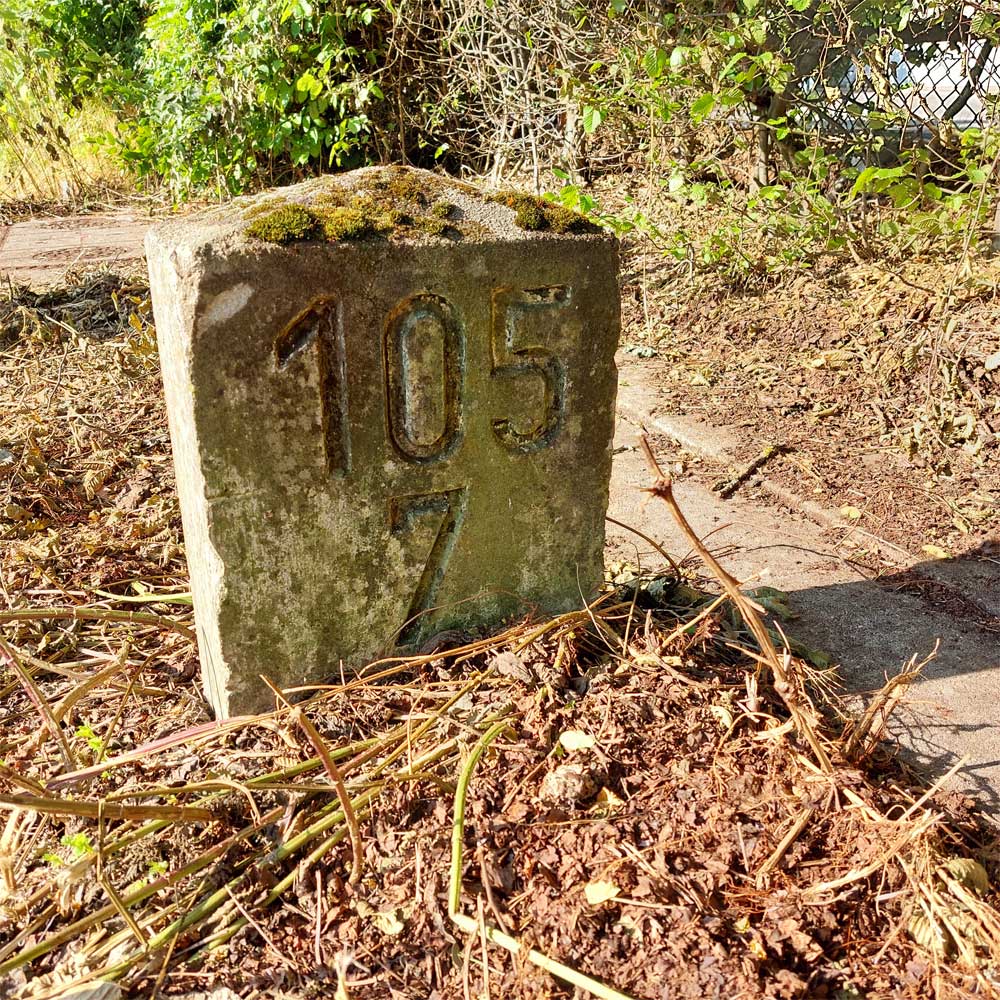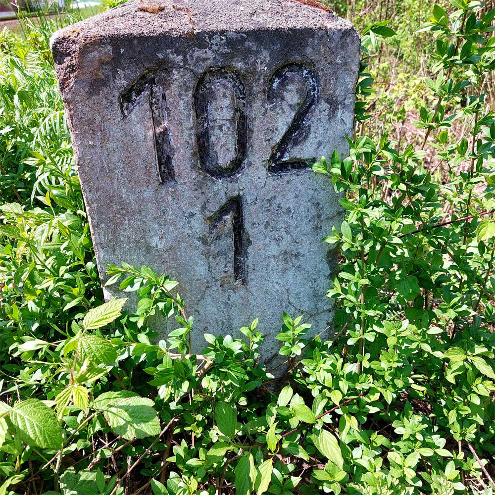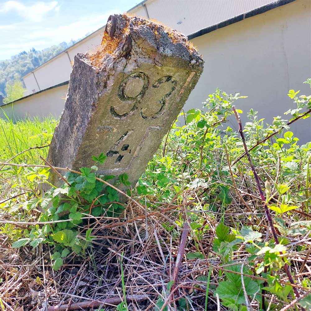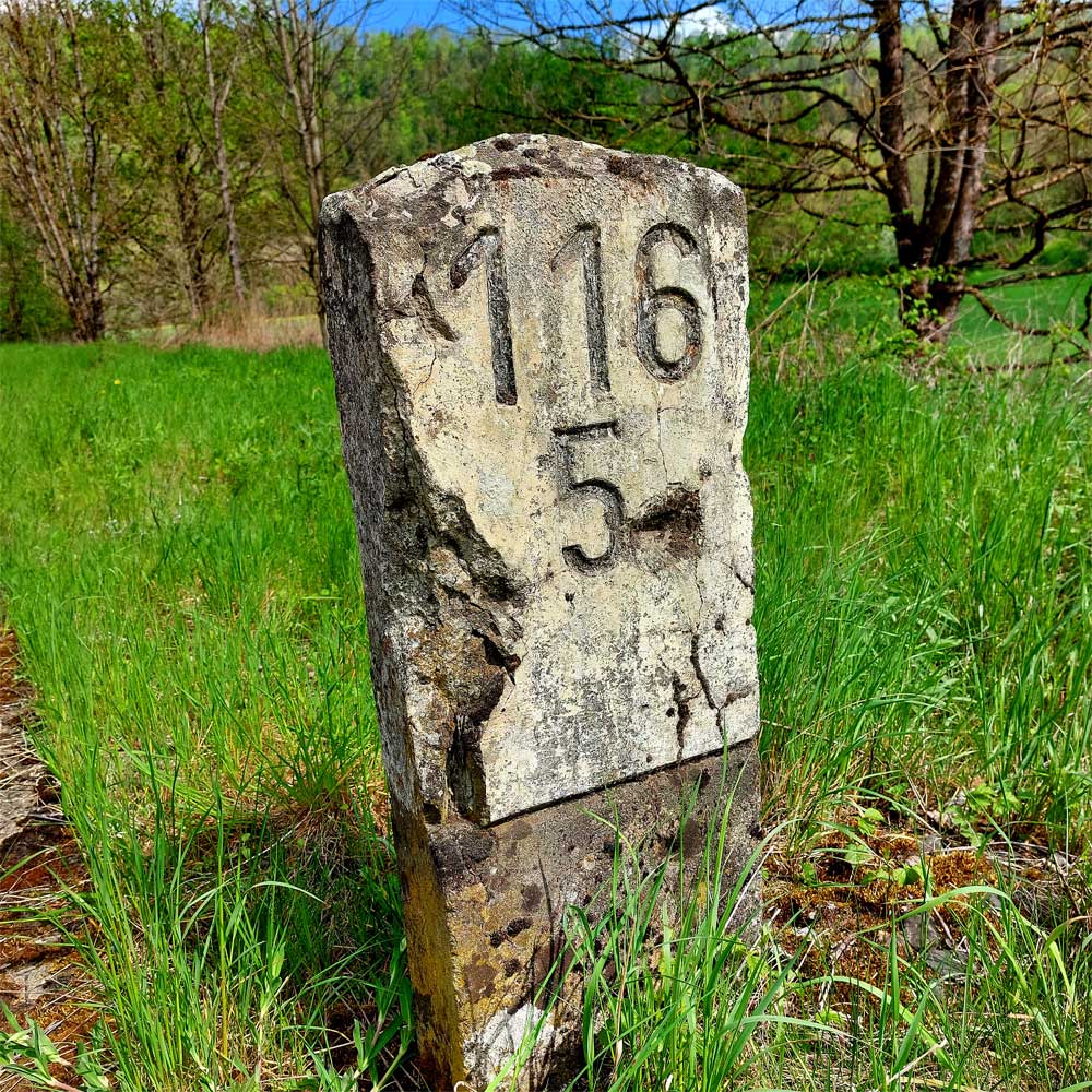 Am linken Bildrand ist ein Kilometerstein zu erkennen.