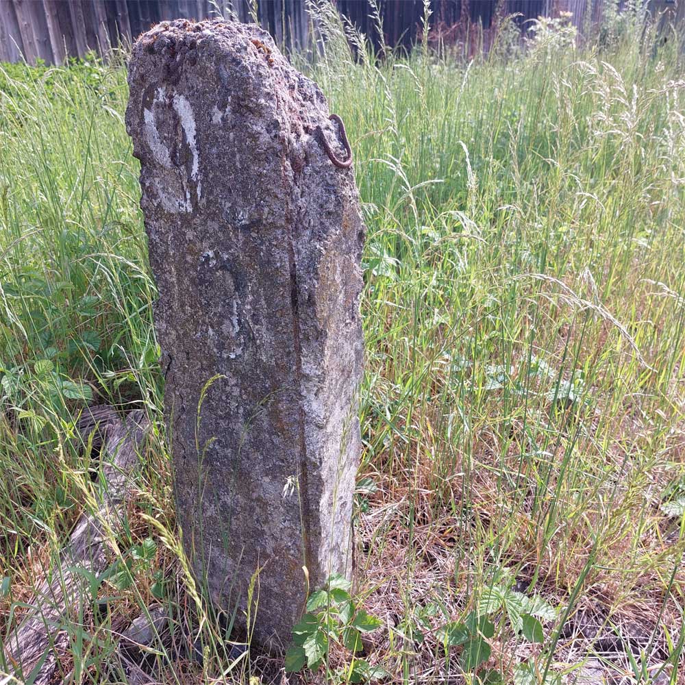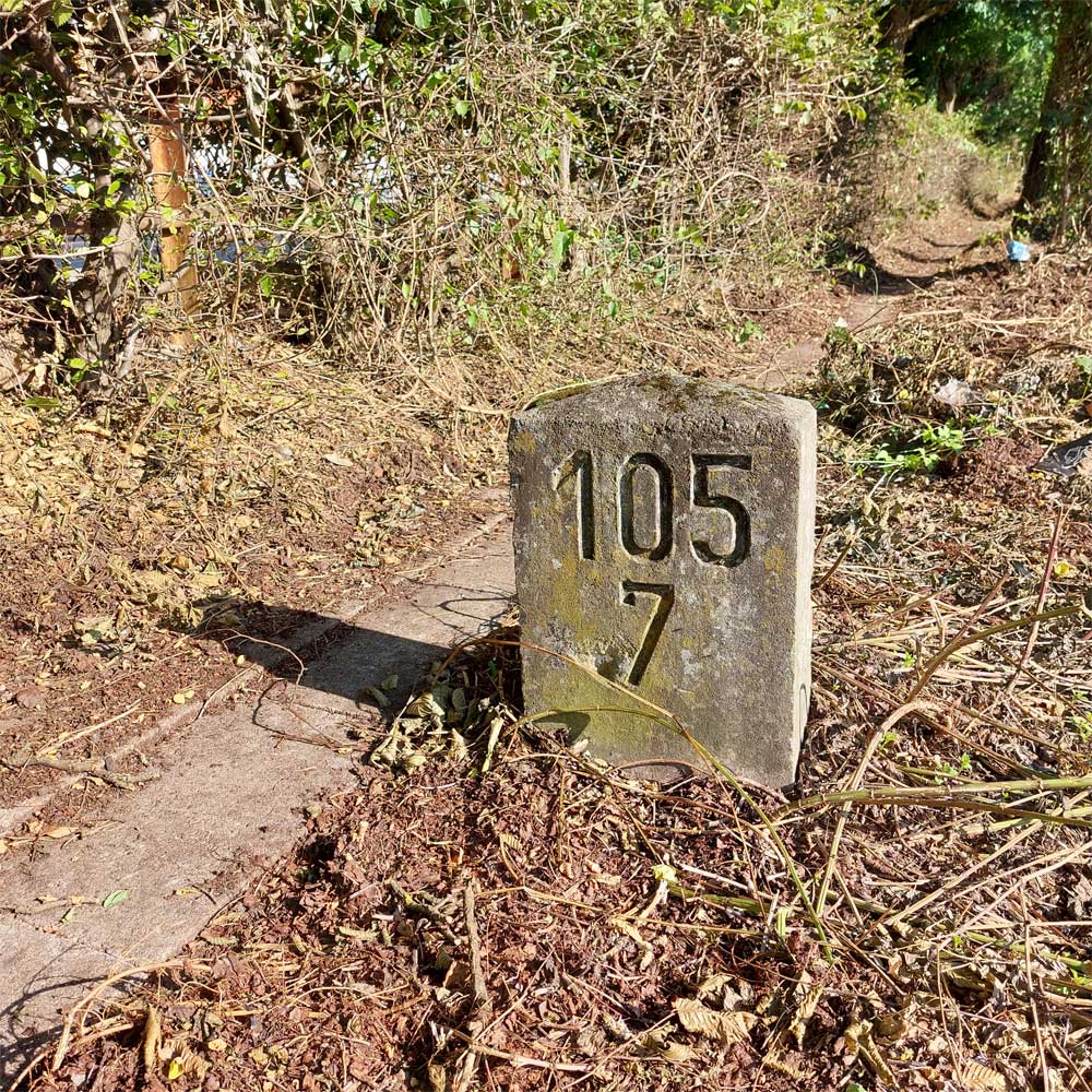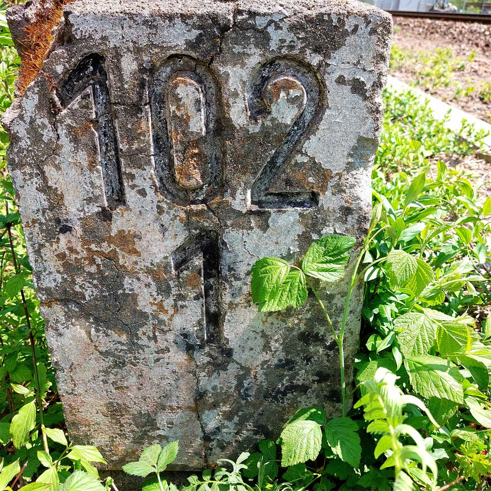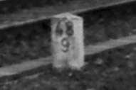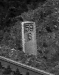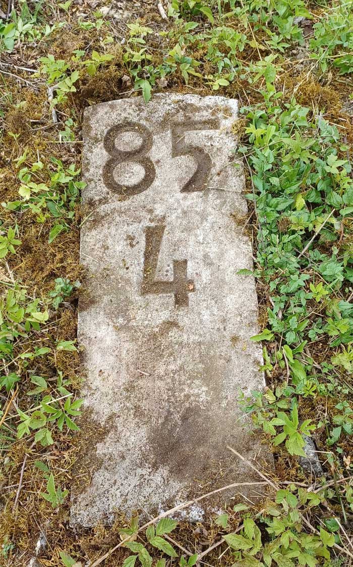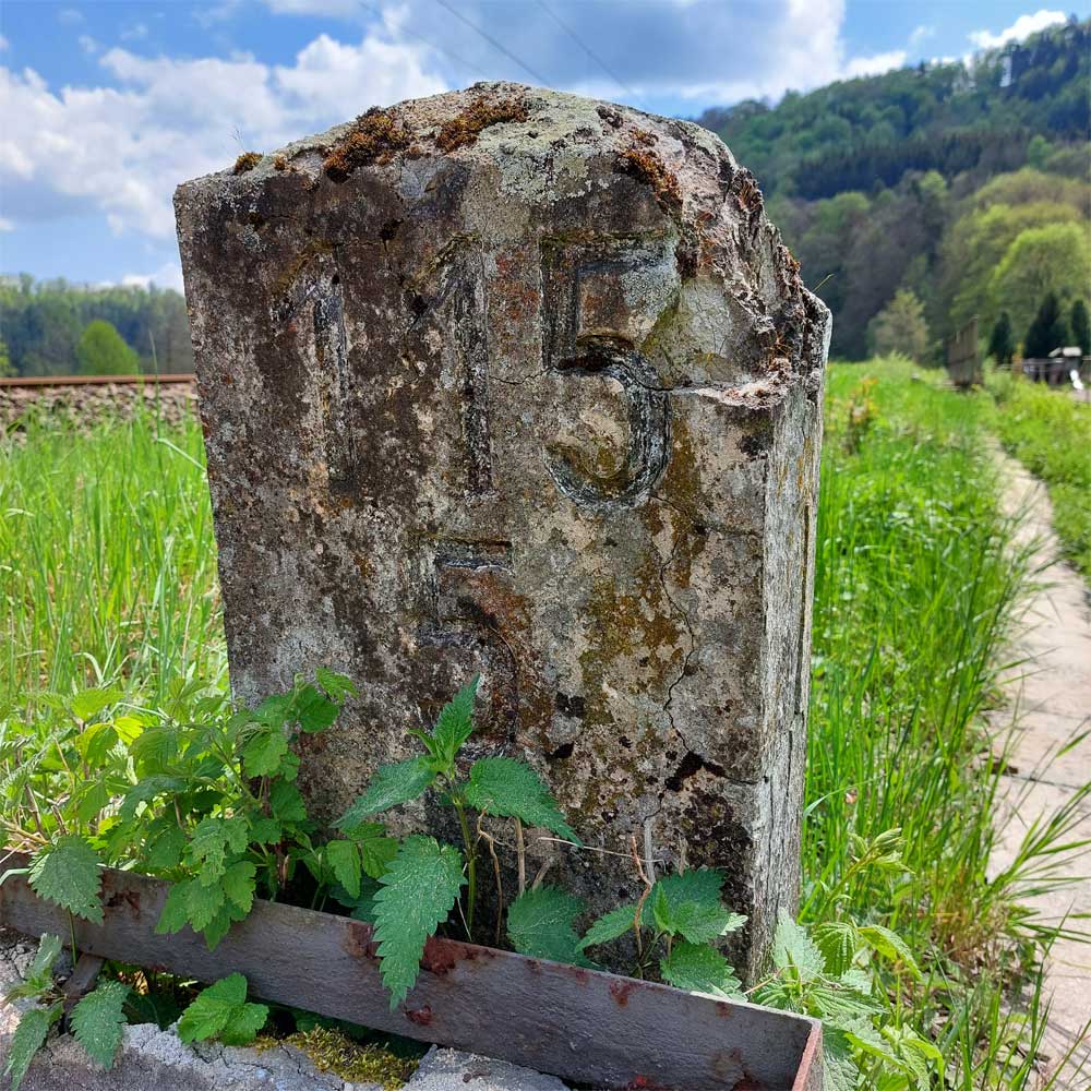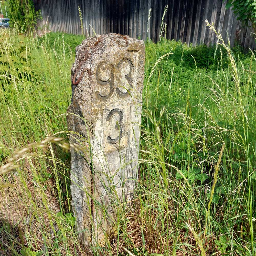 Am linken Bildrand ist ein Kilometerstein zu erkennen.
