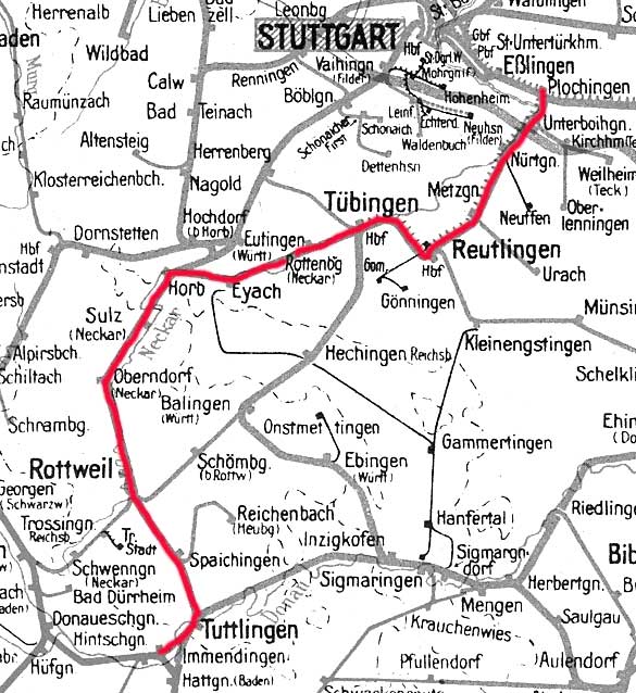 Plochingen 0,0 - Nürtingen 12,57 - Reutlingen Hbf 34,72 - Tübingen Hbf 49,00 - Horb 80,32 - Rottweil123,41 - Tuttlingen 151,17 - Immendingen 161,01