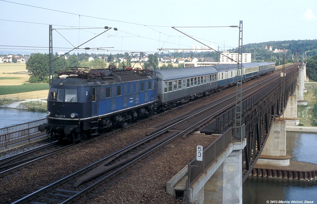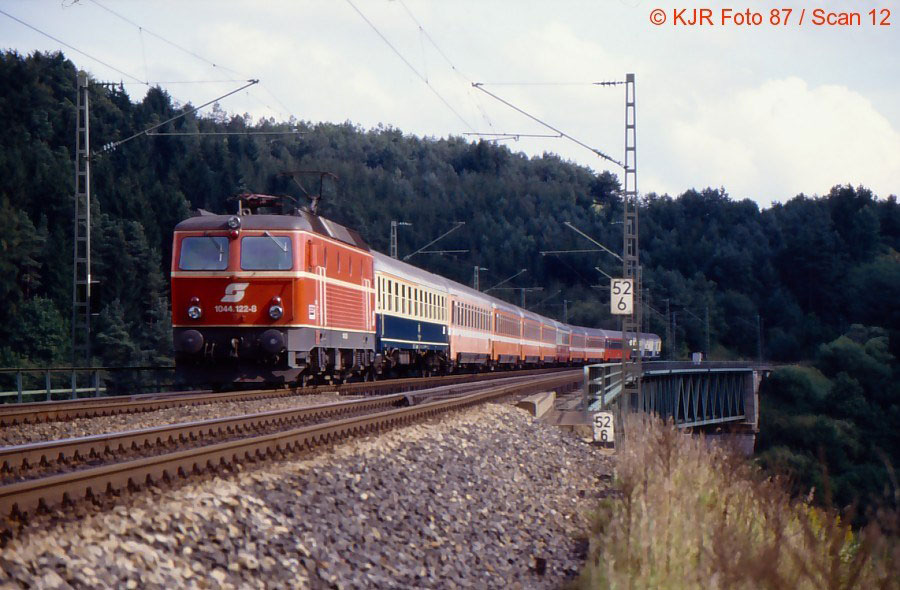 km 52,6 zwischen Seubersdorf und Deining - 1044 122 mit dem vielfarbigen FD 220 Donau-Kurier auf der Laaberbrücke