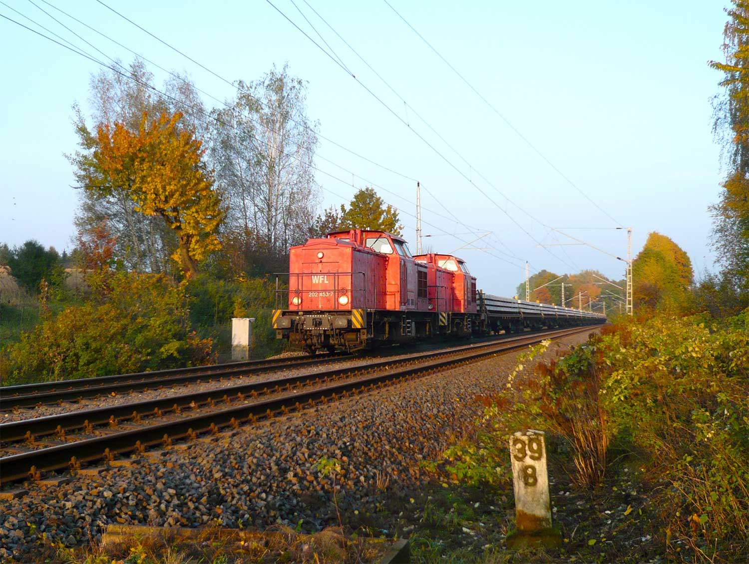 km 39,8 zwischen Waldheim und Schweikershain - 202 453 und 202 822 (WFL) mit einem Schwellenzug