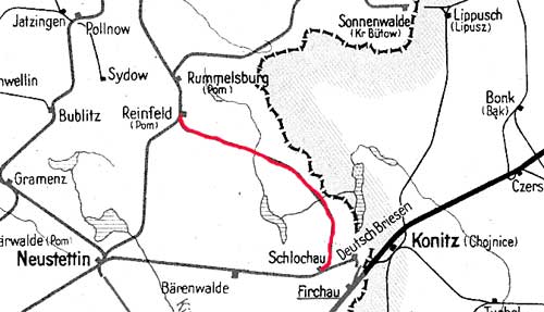 Reinfeld (Pom) | 55,08 | km 37,69 der Strecke Neustettin 0,0 - Rummelsburg (Pom) 45,10 - Zollbrück (Pom) 81,86 - Stolp (Pom) 104,32 - Stolpmünde 121,47 |