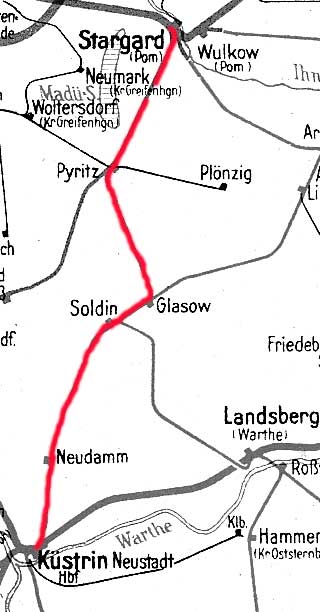 Stargard (Pom) 0,0 km 168,03 der Strecke Berlin Stettiner Bf -0,28 - Stettin Hbf 134,41 - Belgard 280,01 - Stolp 371,46 - Groß Boschpol 439,03 - Grenze Deutschland/Polnischer Korridor 442,275 = [km 92,994 - Danzig Hbf 32,69 - Tczew (Dirschau) 0,0] (1920-1939)