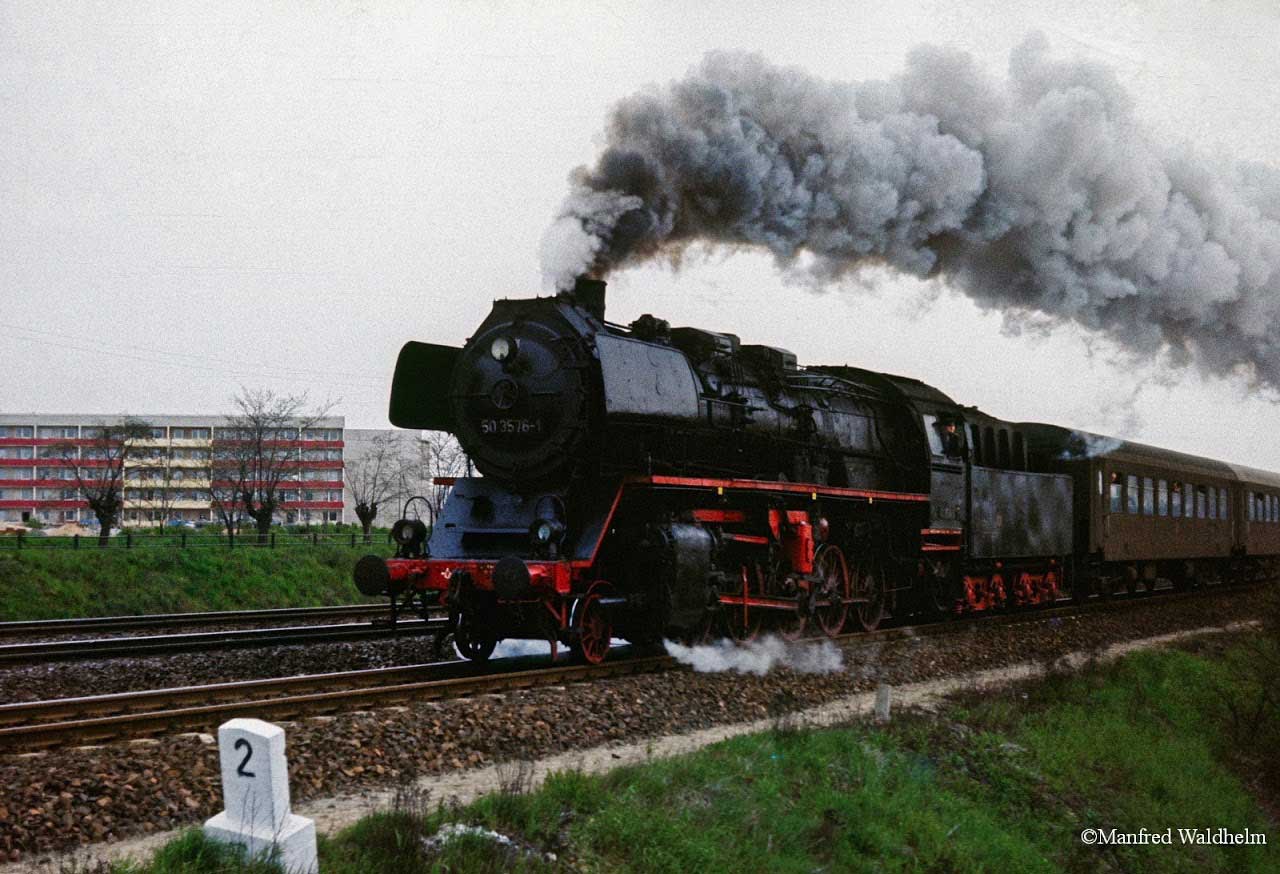 km 2,0 in Stendal - 50 3577 vom Bw Salzwedel verläßt Stendal mit einem Güterzug in Richtung Heimat