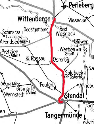 km 0,0 der Strecke Stendal 0,0 - Tangermünde 10,2 - Tangermünde Ladestellen am Elb- und Hafenufer 13,4 (Stendal-Tangermünder Eisenbahn-Gesellschaft) mit strategischer Verbindung (1944/1945) über die Elbe nach Fischbeck zur Strecke der Genthiner Eisenbahn AG | ||