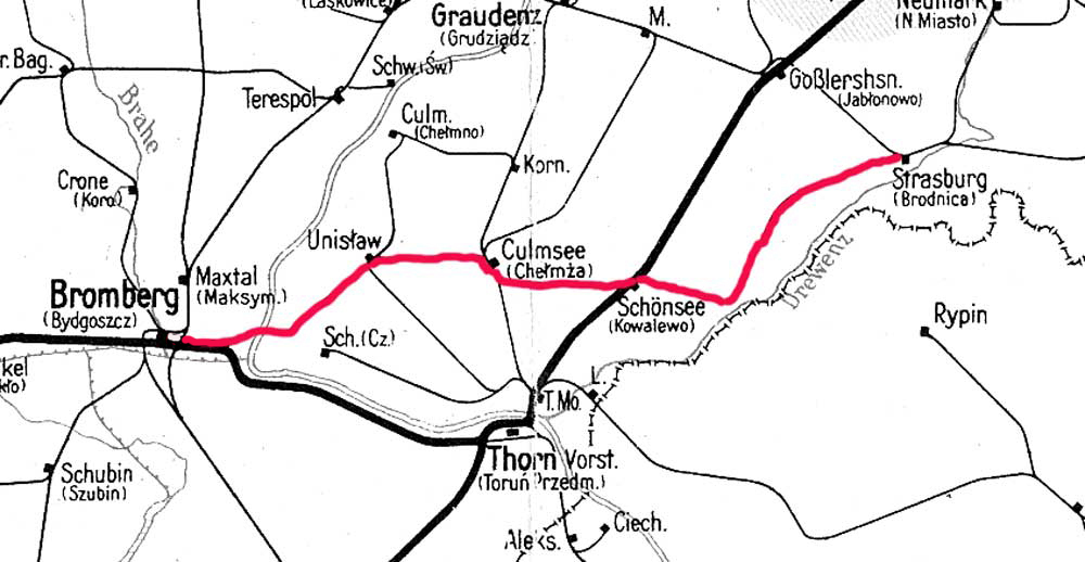 Strasburg (Westpr) 0,0 - Schönsee (Westpr) 49,7 - Culmsee 70,0 - Unislaw 85,0 - Bromberg Ost 109,0