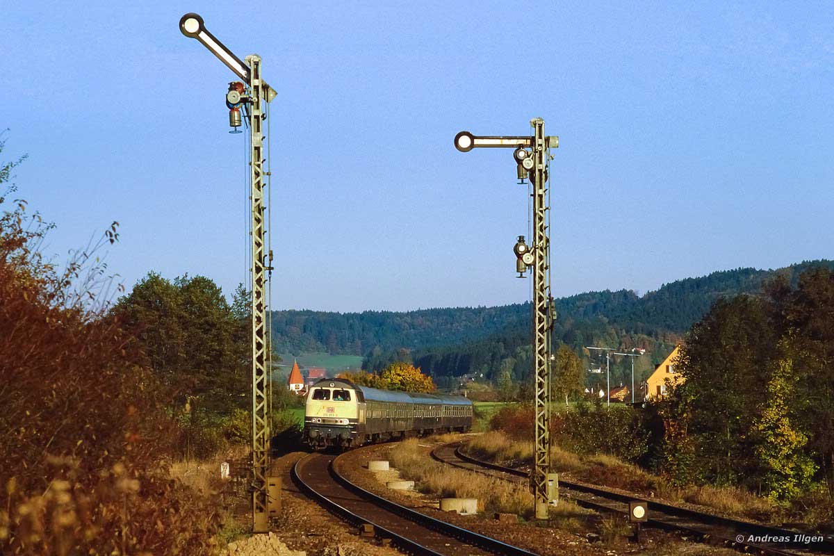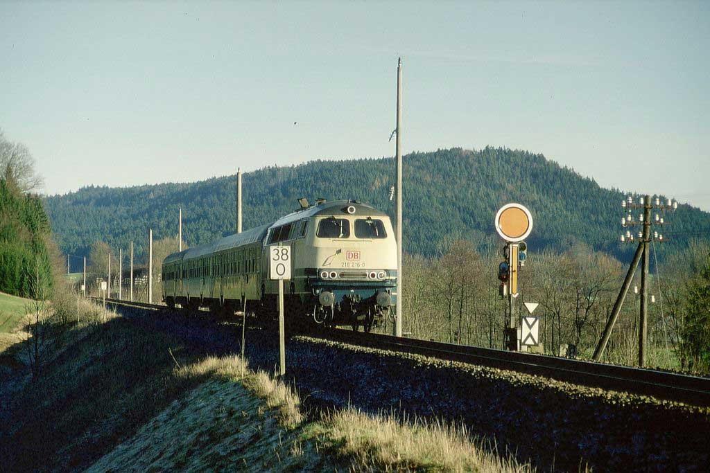 218 216 passiert mit Eilzug Nürnberg Hbf – Stuttgart Hbf zwischen Fornsbach und Murrhardt das Fornsbacher Einfahrtvorsignal