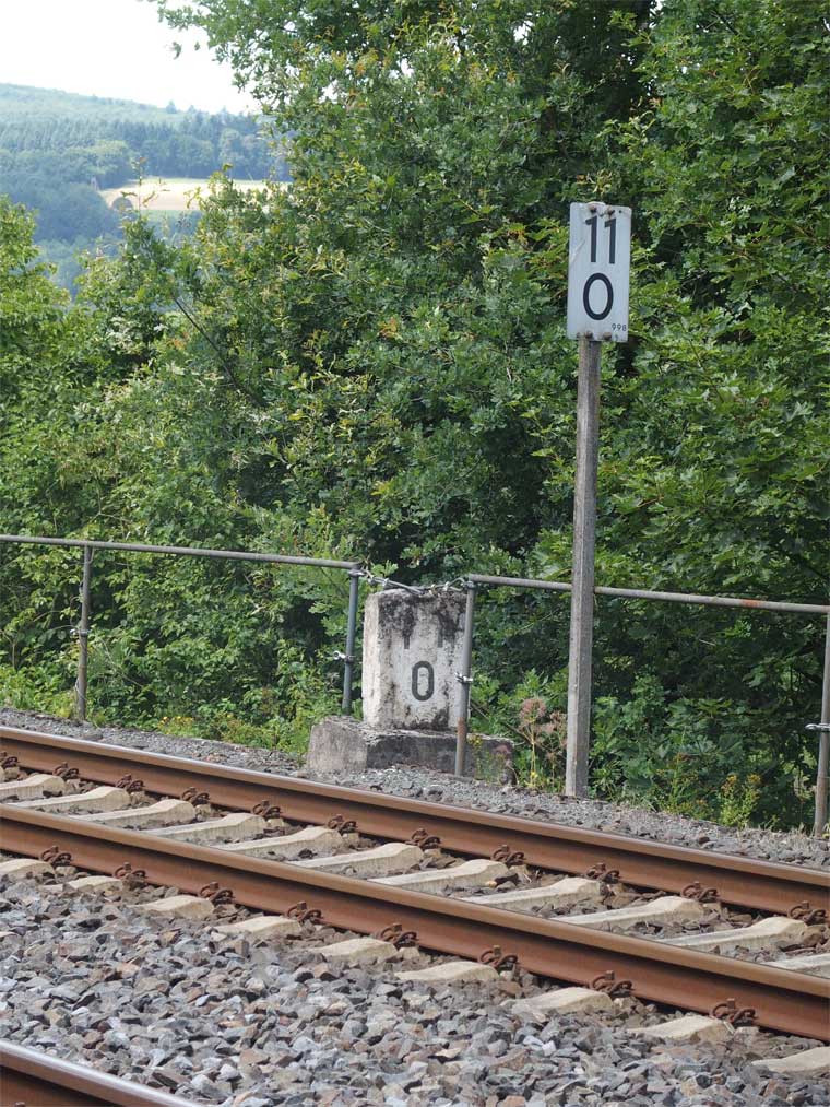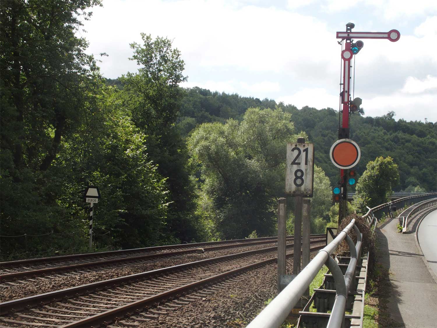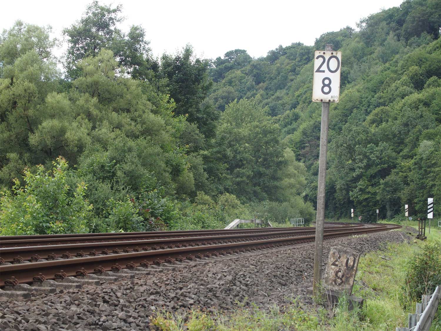 km 21,6 (Tafel im Hintergrund); km 21,7 (Stein rechts neben den Gleisen) und km 21,8 (Stein im Vordergrund) zwischen Löhnberg und Weilburg - Blick Richtung Wetzlar