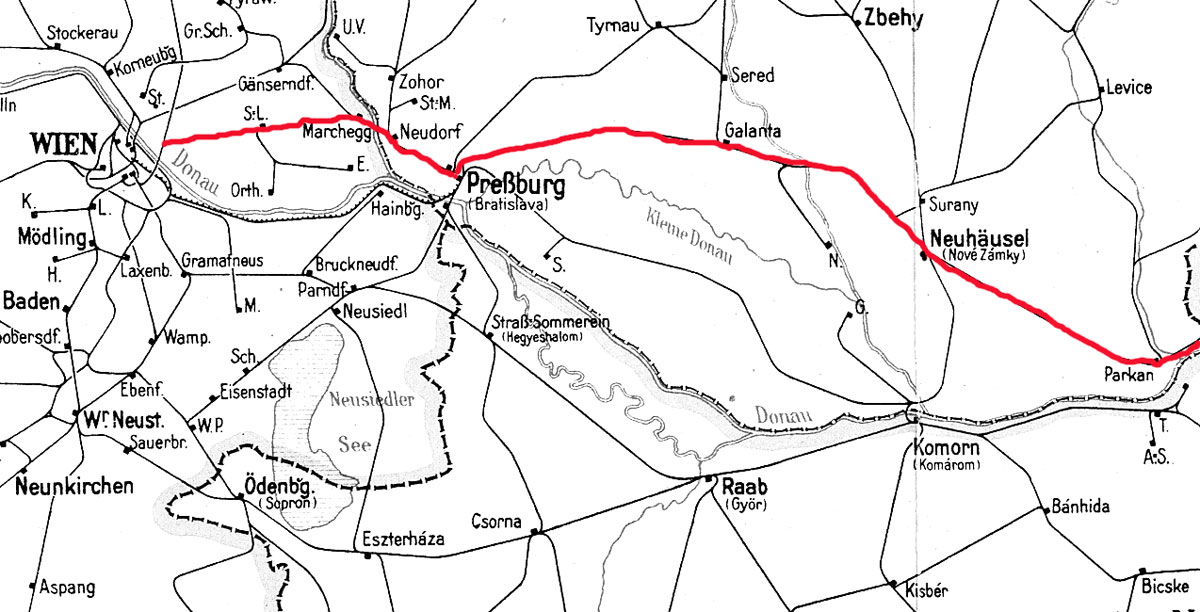 Wien Stadlau 0,0 - Marchegg 35,606 - Grenze Österreich/Slowakei 37,910 - Theben-Neudorf (Devínska Nová Ves) 41,530 - Bratislava Hbf (Bratislava hlavná stanica) 54,364 - Gallandau (Galanta) 103,053 - Neuhäusel (Nové Zámky) 145,385 - Gockern (Štúrovo) 189,584 - Grenze Slowakei/Ungarn 203,394 = km 63,7 - Zopp (Szob) 63,1 - Budapest Westbahnhof (Budapest-Nyugati) 0,0