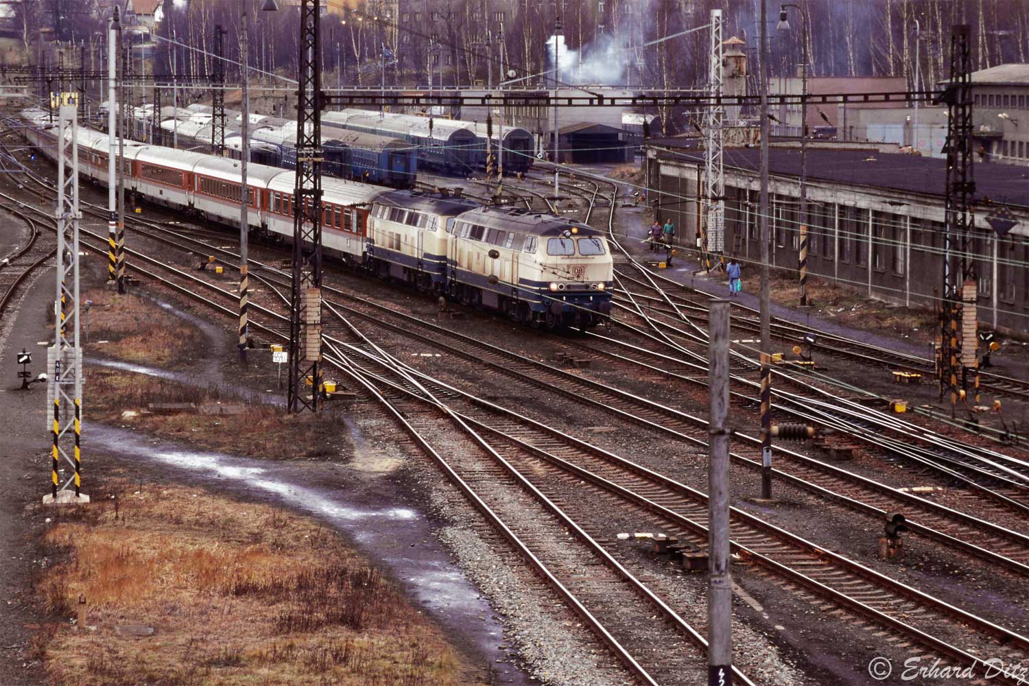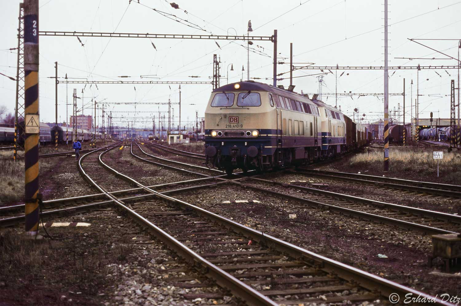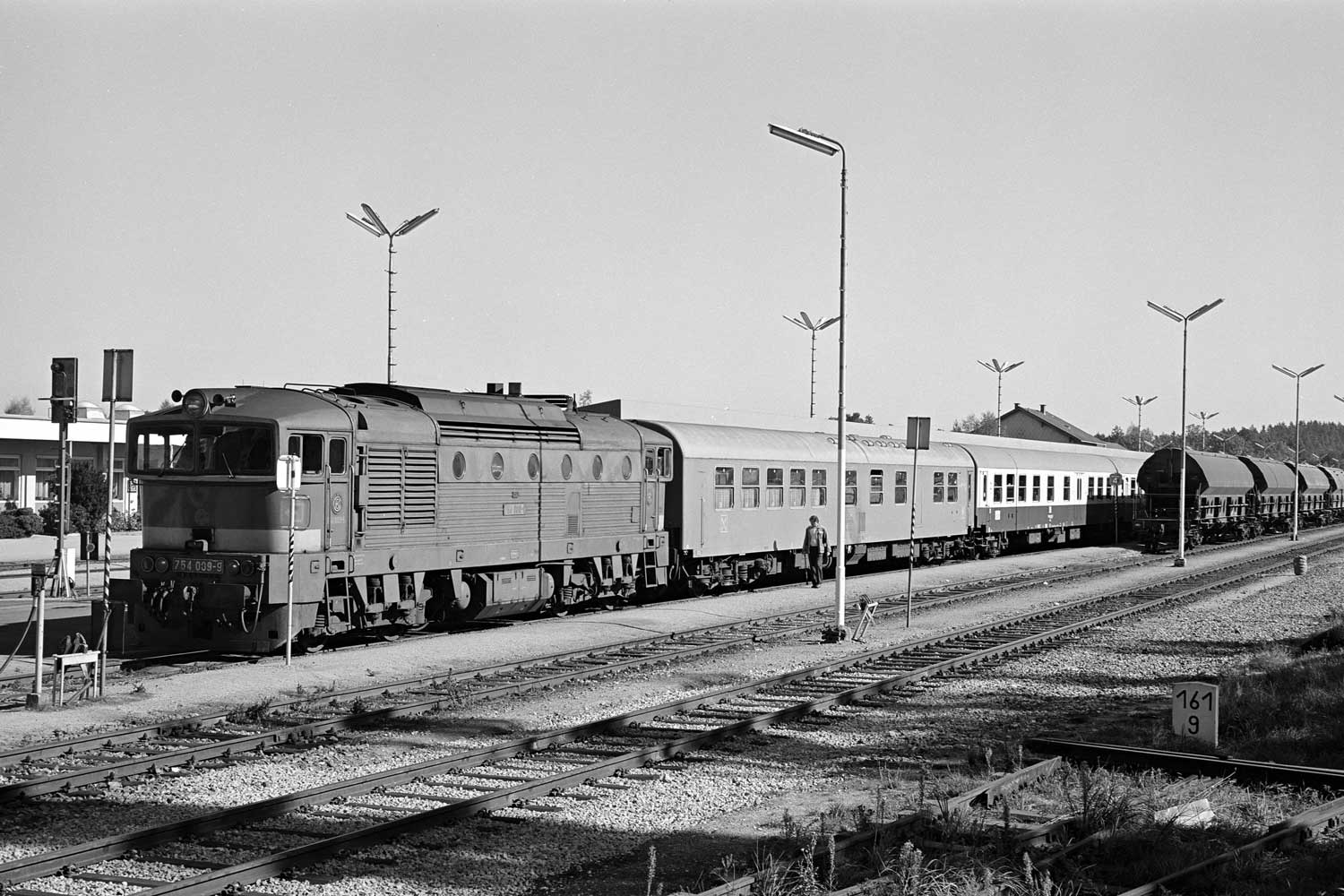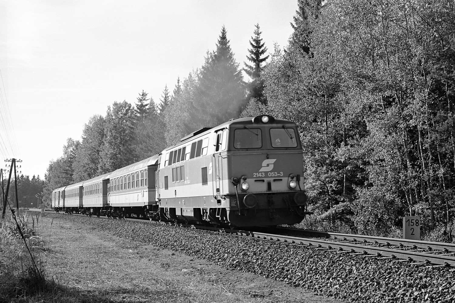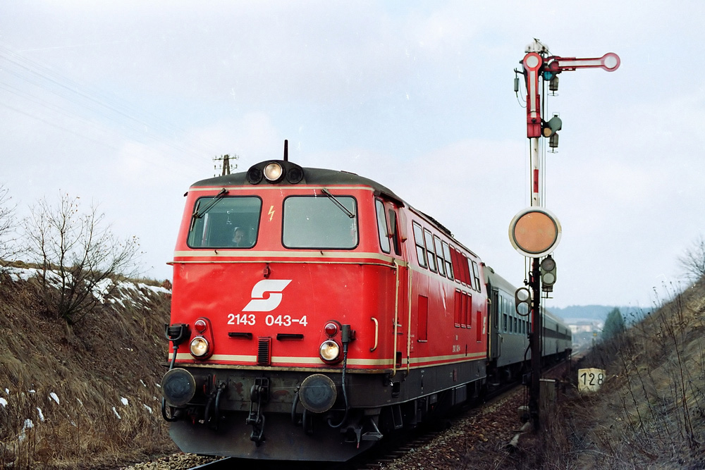 km 128,0 in Allentsteig 2143.043 mit D 275 (Prag - Wien FJB) Foto: Altbauelok, 27.02.1991