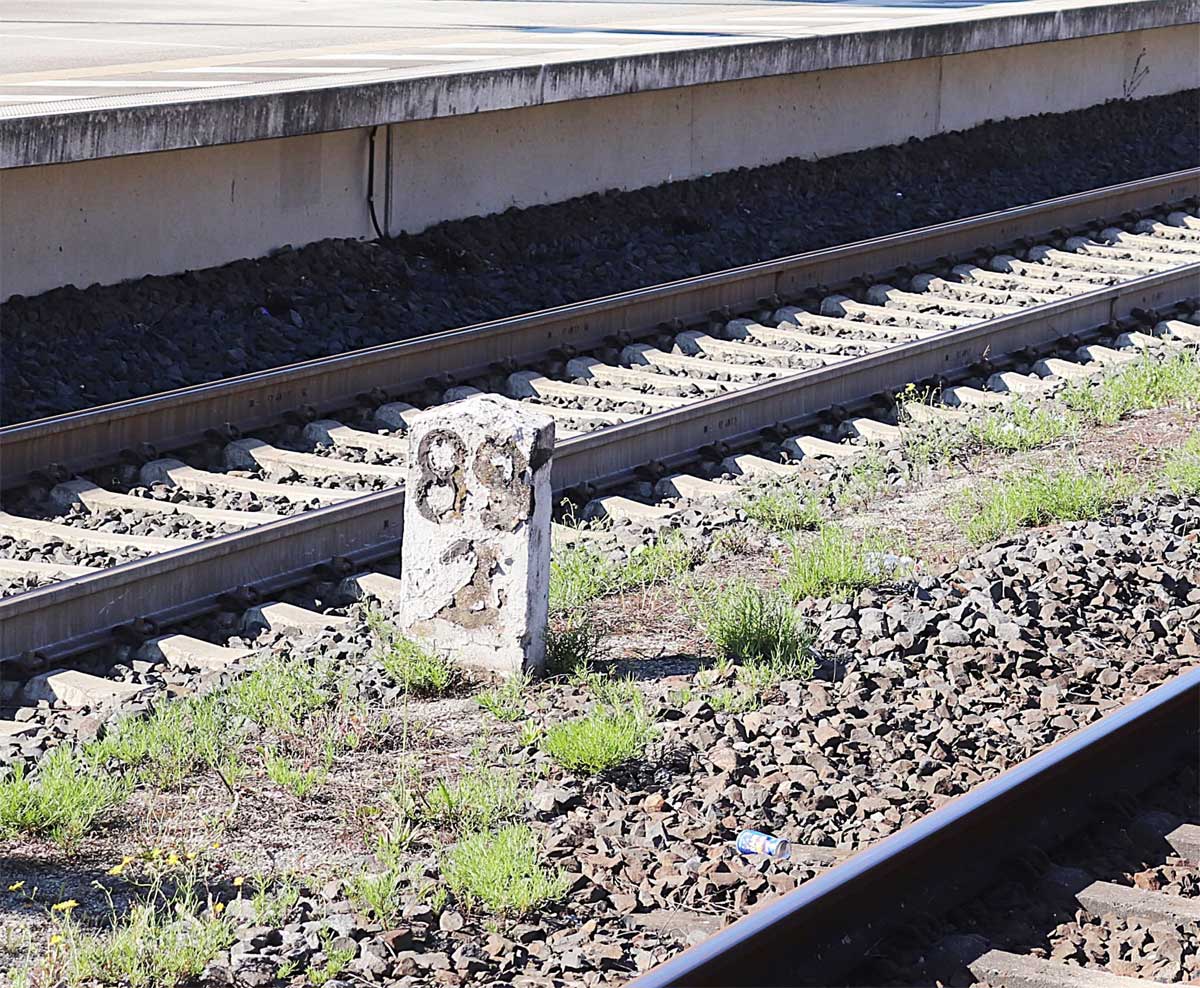 km 89,0 (Stein und Tafel) und km 89,1 (Stein) in Aschaffenburg Hbf