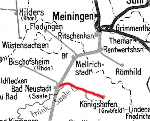 Bad Neustadt (Saale) 0,0 km 38,76 der Strecke Schweinfurt Hbf 0,0 - Bad Neustadt (Saale) 38,76 - Mühlfeld 57,10 Streckenunterbrechung Grenze BRD/DDR - Rentwertshausen 63,17 - Meiningen 77,90