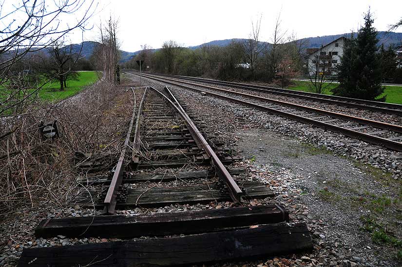 Rechts die Reste der abgehenden Strecke nach Bad Säckingen