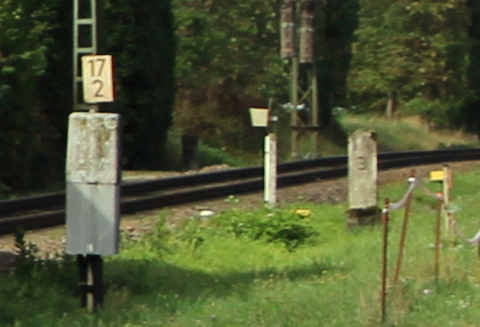 km 17,2 (Tafel); km 17,3 (Stein) und km 17,4 (Stein) in Maulburg - Blick Richtung Basel