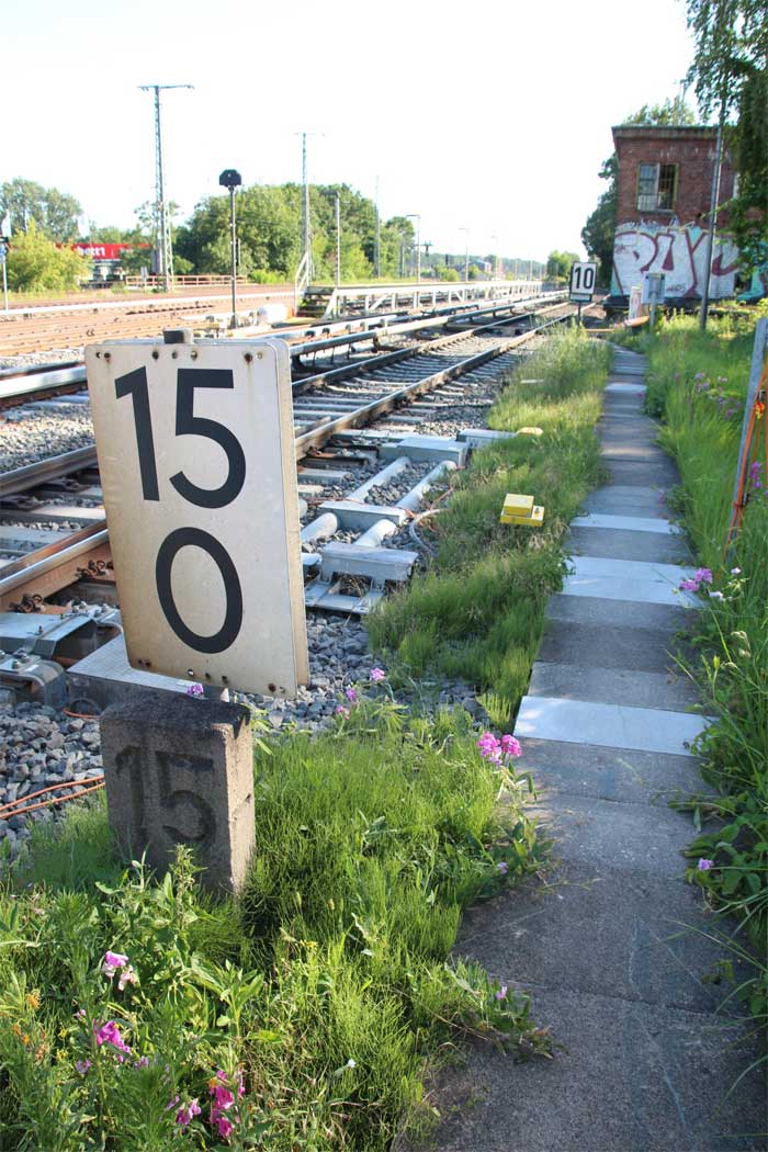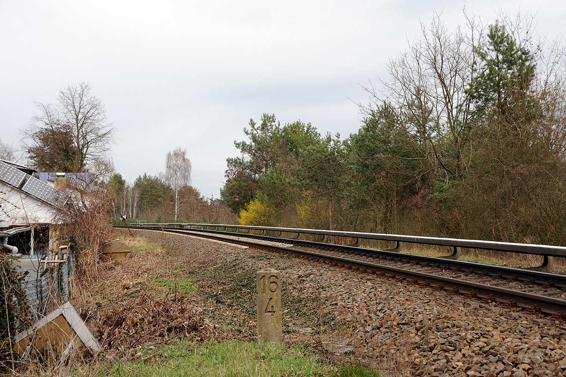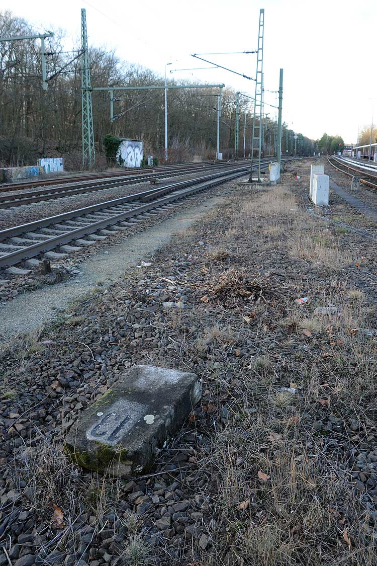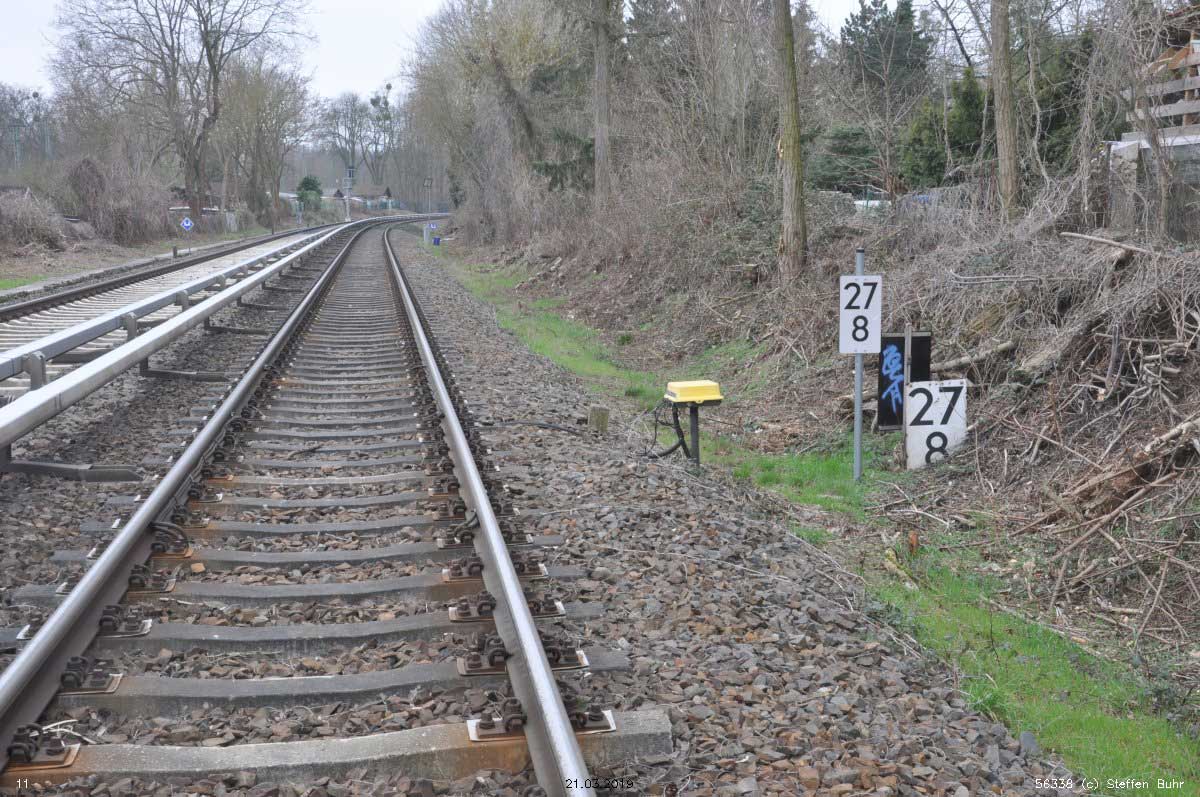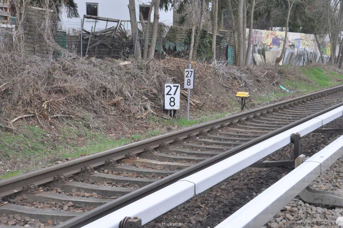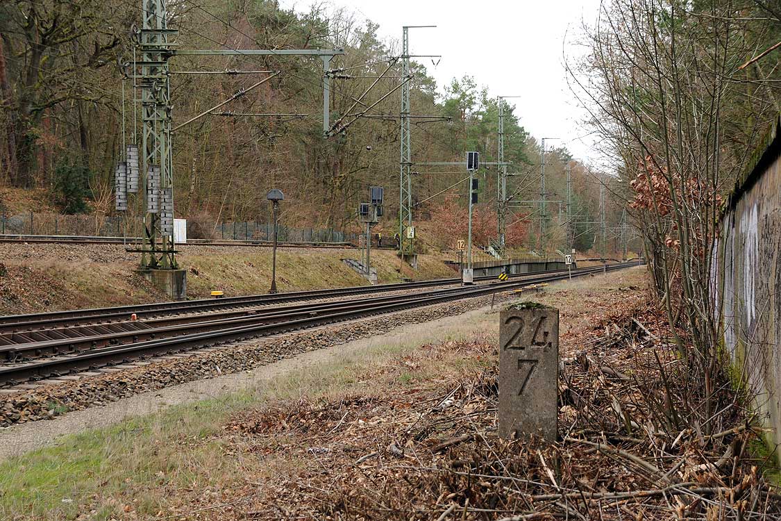 Vor dem Stellwerk Pdo ist noch der Stein km 25,3 zu erkennen.