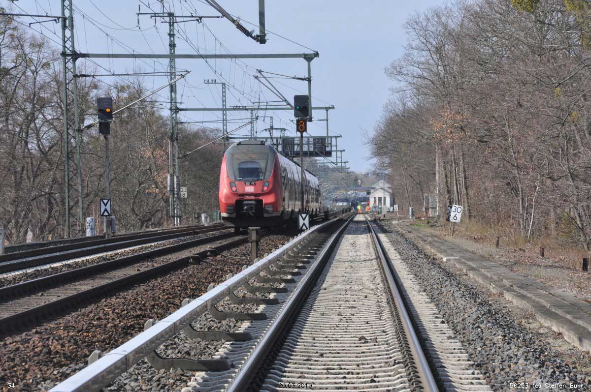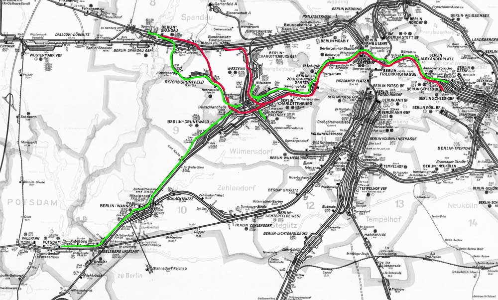 Berlin Schlesischer Bf 0,0 - Berlin Friedrichstraße 3,97 - Berlin Zoologischer Garten 9,01 - Berlin-Charlottenburg 11,26 - Berlin-Grunewald 14,63 - Nikolassee 22,49 - Berlin-Wannsee 24,06 - Potsdam 32,98 (Stadtbahn)