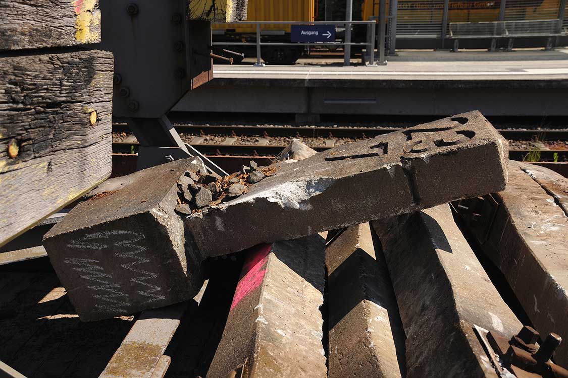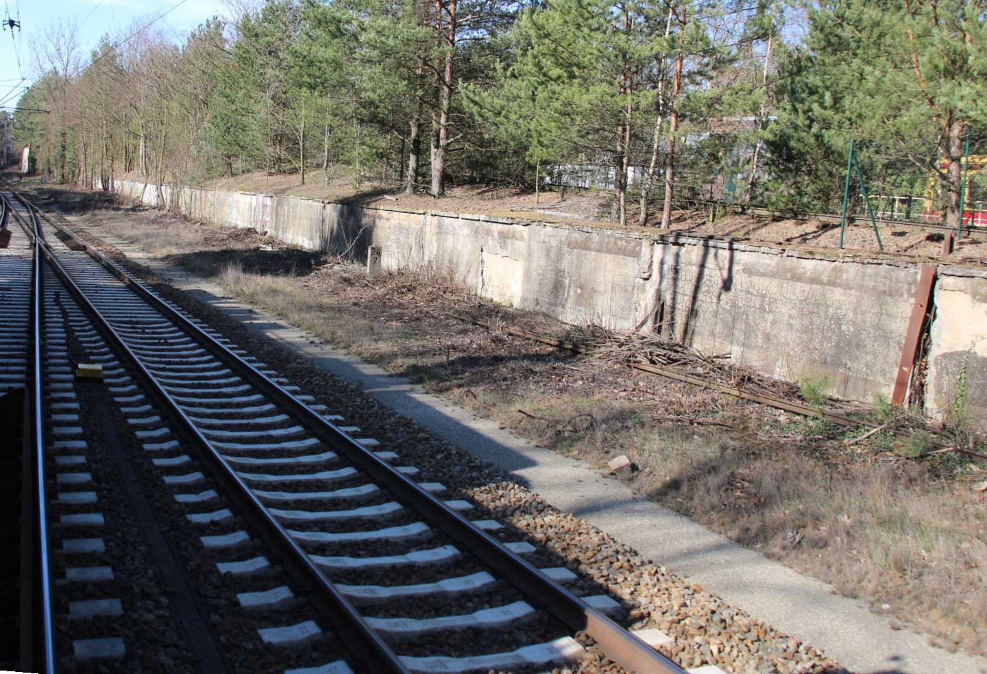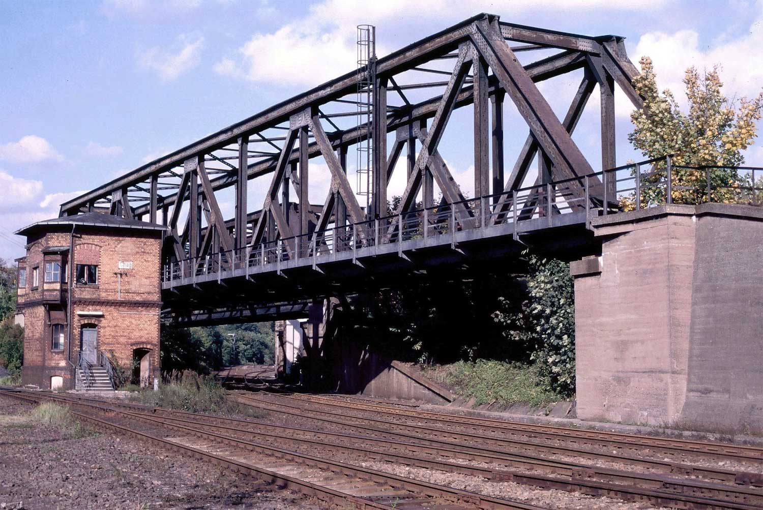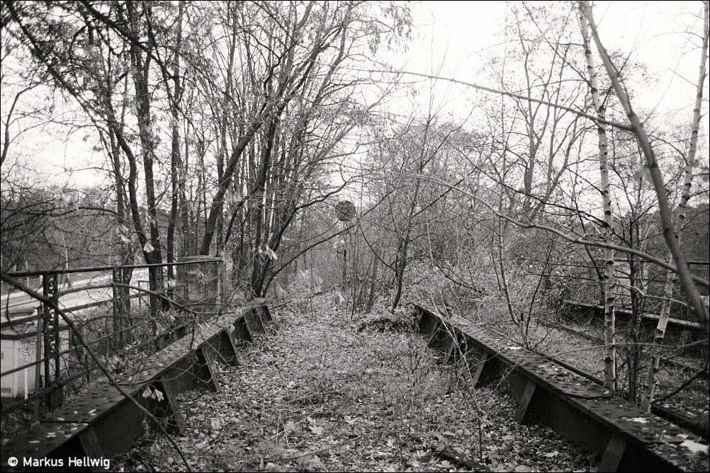 Brückenleitschienen, rechts die freie Trasse des zweiten Streckengleises, das nach 1945 reparationshalber abgebaut wurde