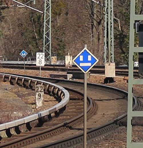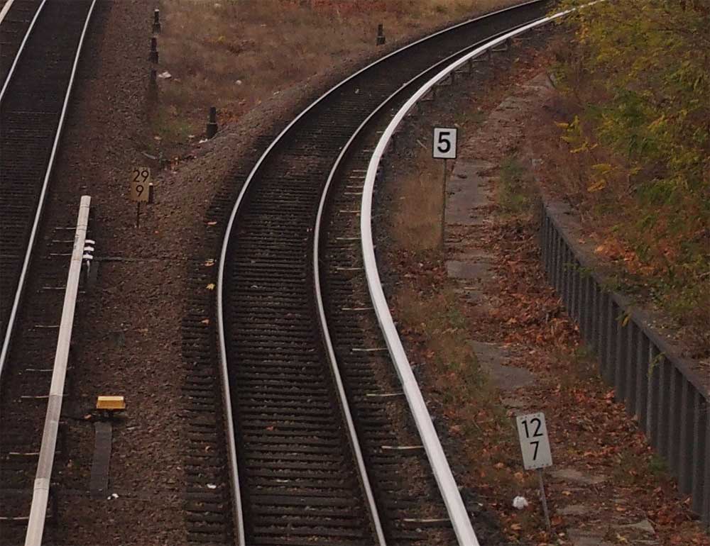 è | km 11,26 der abgehenden Strecke (Berlin Schlesischer Bf 0,0) - Charlottenburg 11,26 - Grunewald Pbf 14,70 mit weiterlaufender Kilometrierung | ||